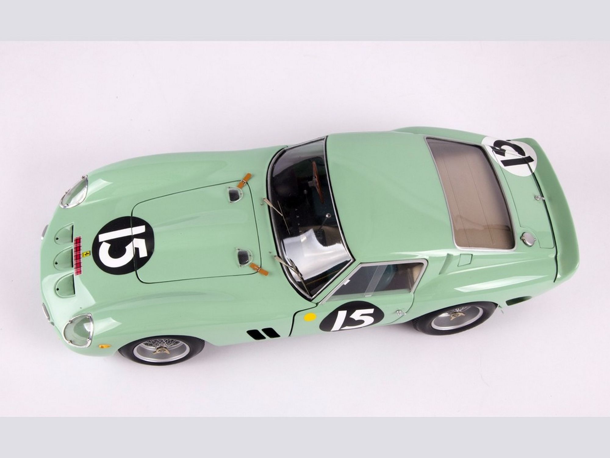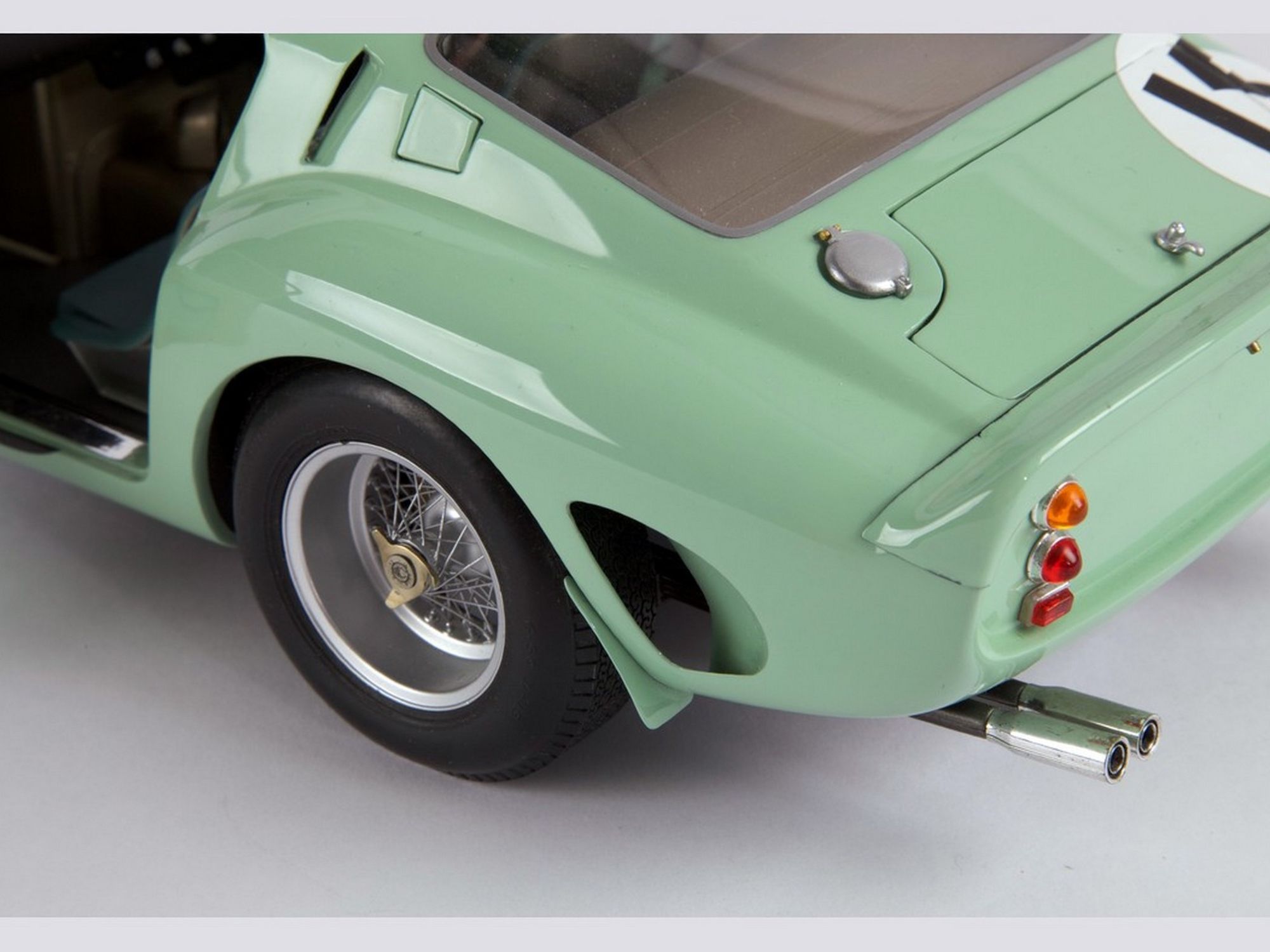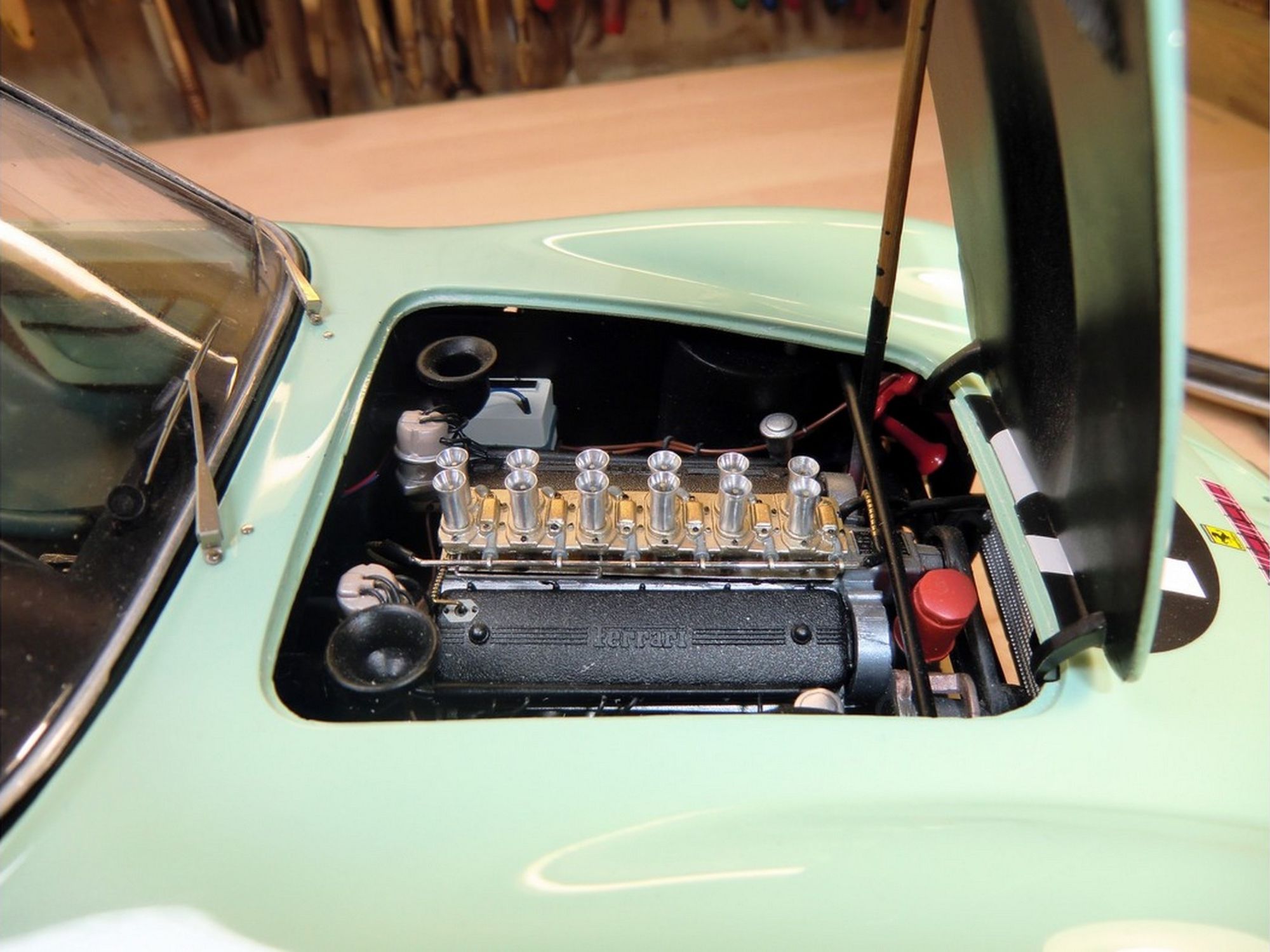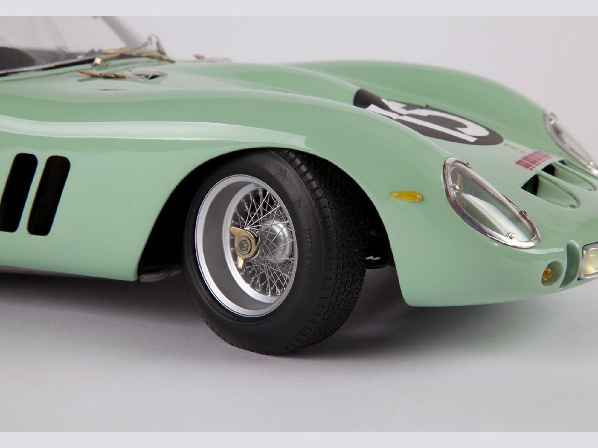 Starting from the Revell body; the nose was completely recreated; the air vents were all enlarged and the trunk cover, in aluminum, was made to be opened. The rear wheel fenders were widened and a completely new rear spoiler was machined. The ‘Borrani’ spoke wheels were handmade spoke by spoke. On the engine the carburetors pipes were machined in solid aluminum. Finally, the steering wheel and full direction were built in right hand drive.