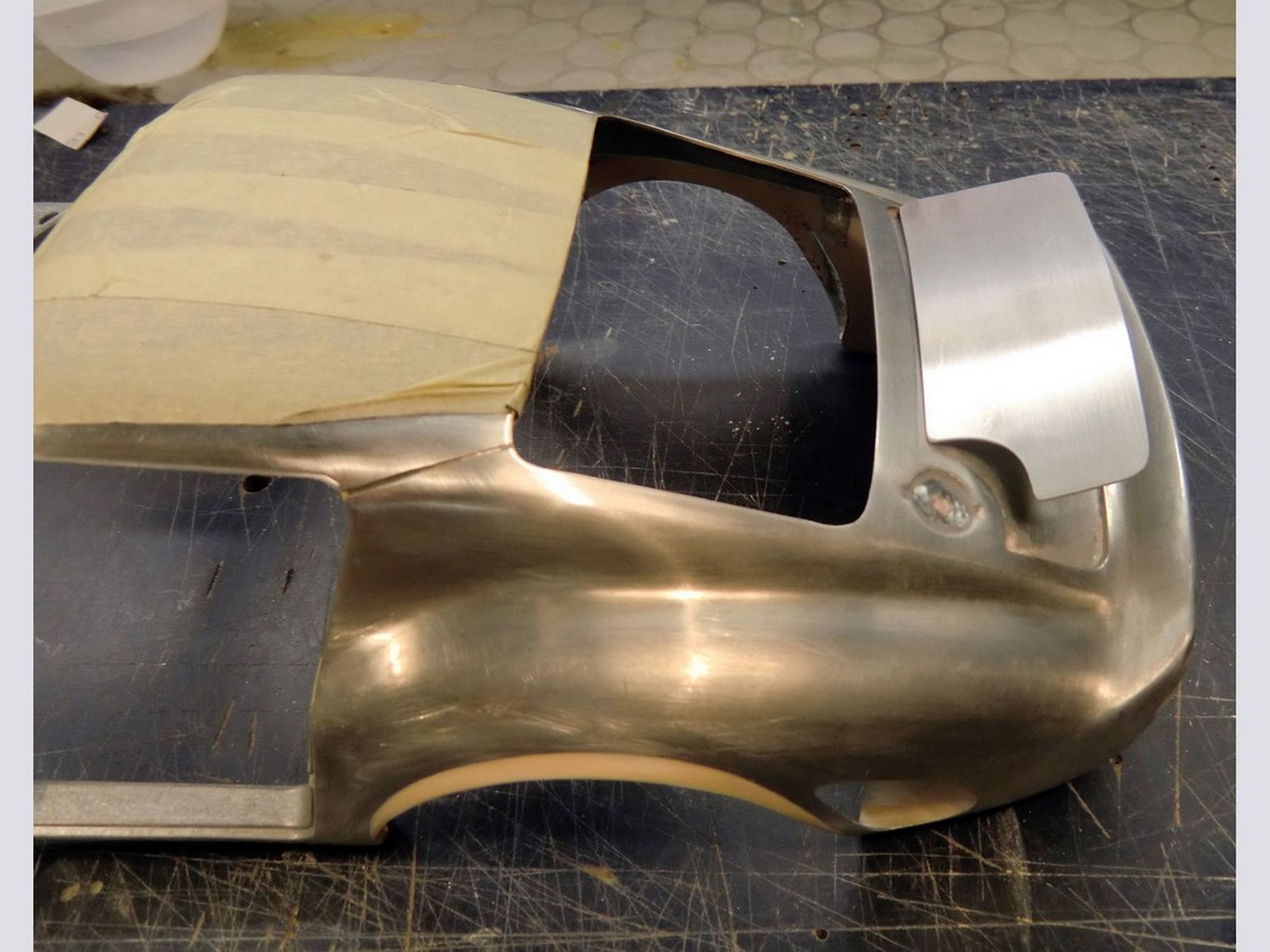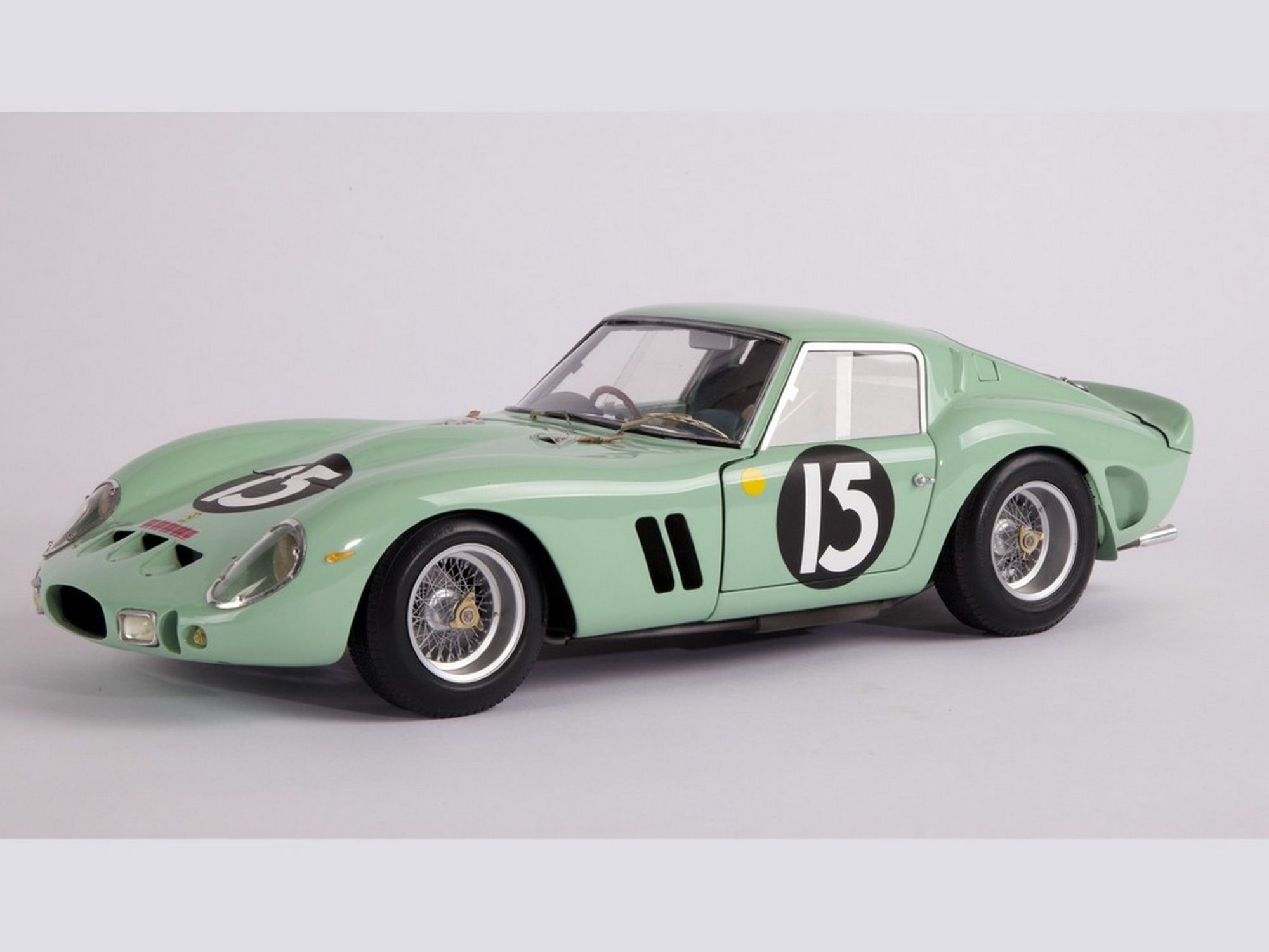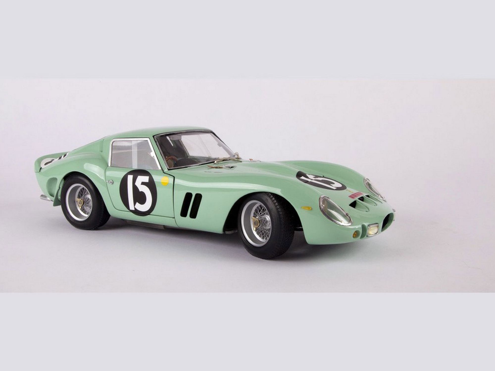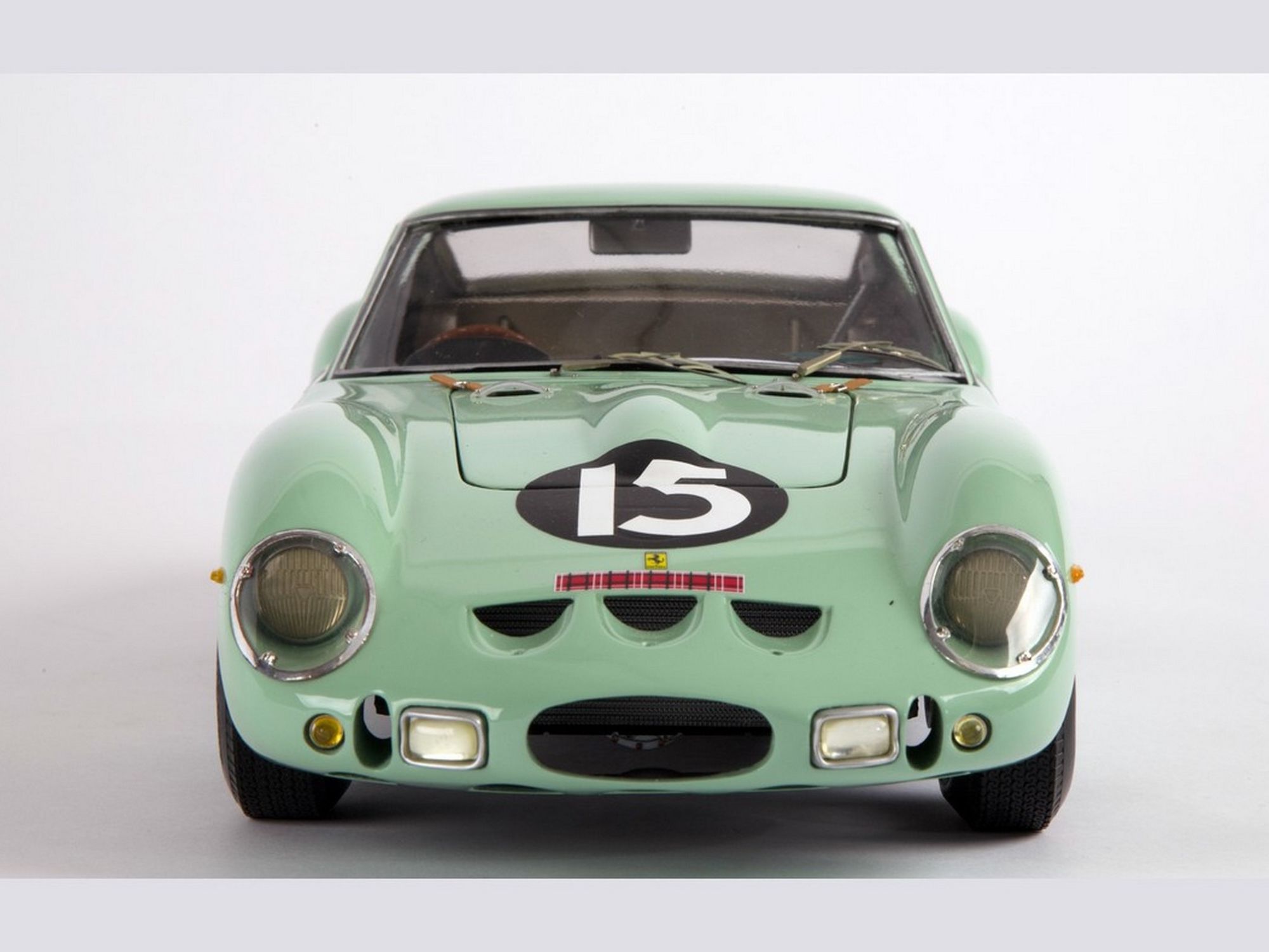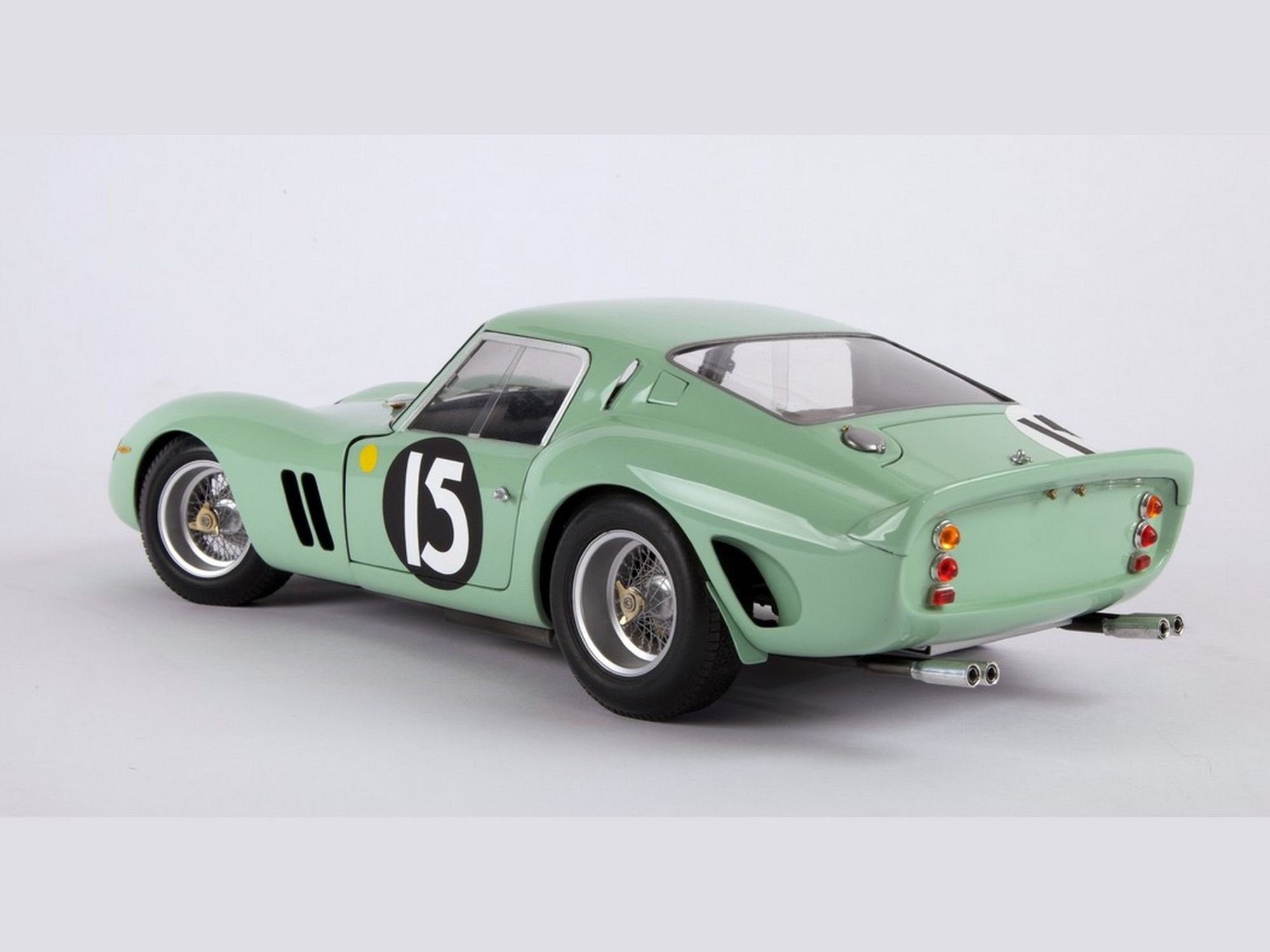 Starting from the Revell body; the nose was completely recreated; the air vents were all enlarged and the trunk cover, in aluminum, was made to be opened. The rear wheel fenders were widened and a completely new rear spoiler was machined. The ‘Borrani’ spoke wheels were handmade spoke by spoke. On the engine the carburetors pipes were machined in solid aluminum. Finally, the steering wheel and full direction were built in right hand drive.
