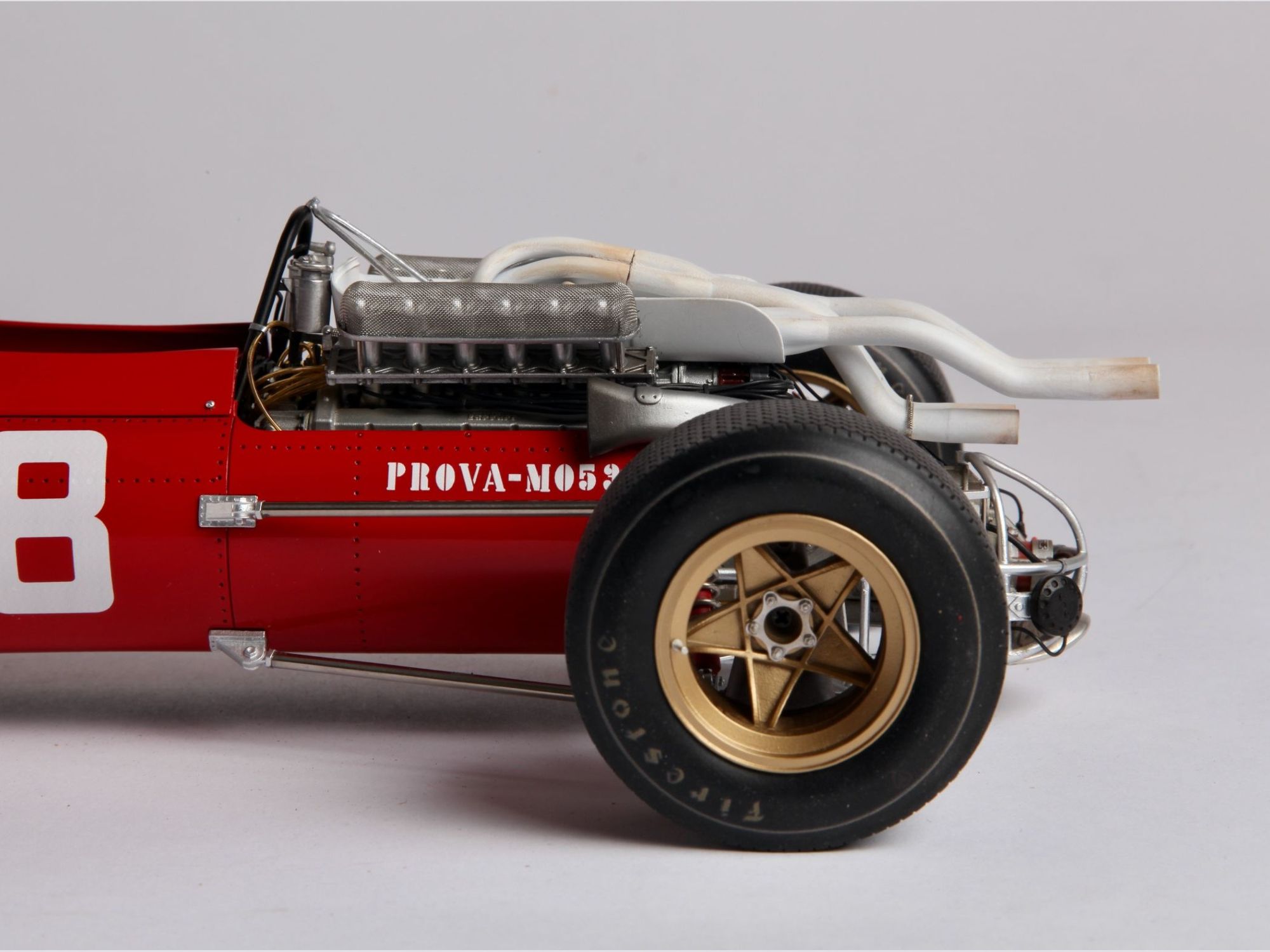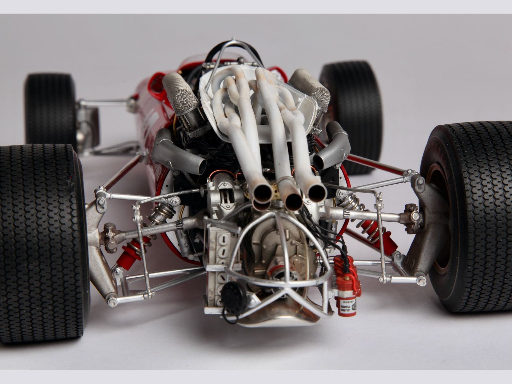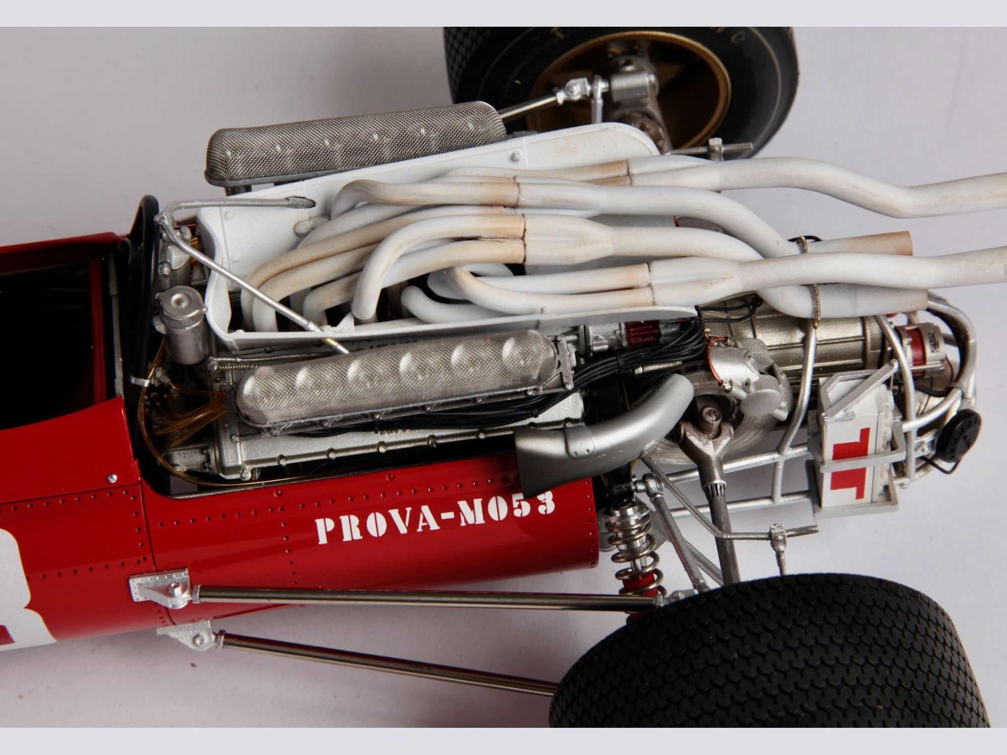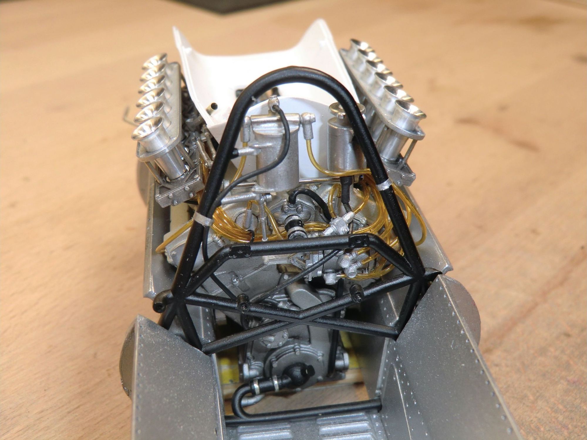 This very detailed model with a lot of accessories, all of which were cleaned or machined to fit perfectly during mounting. The different piping and ‘spaghetti” exhausts are a real challenge and need special attention to be placed with great care. The rivets alongside the engine had to be removed and placed much higher to correspond to the real racing car on that moment in 1967.