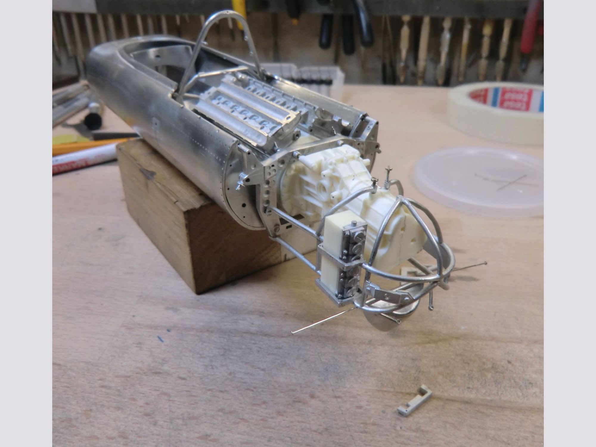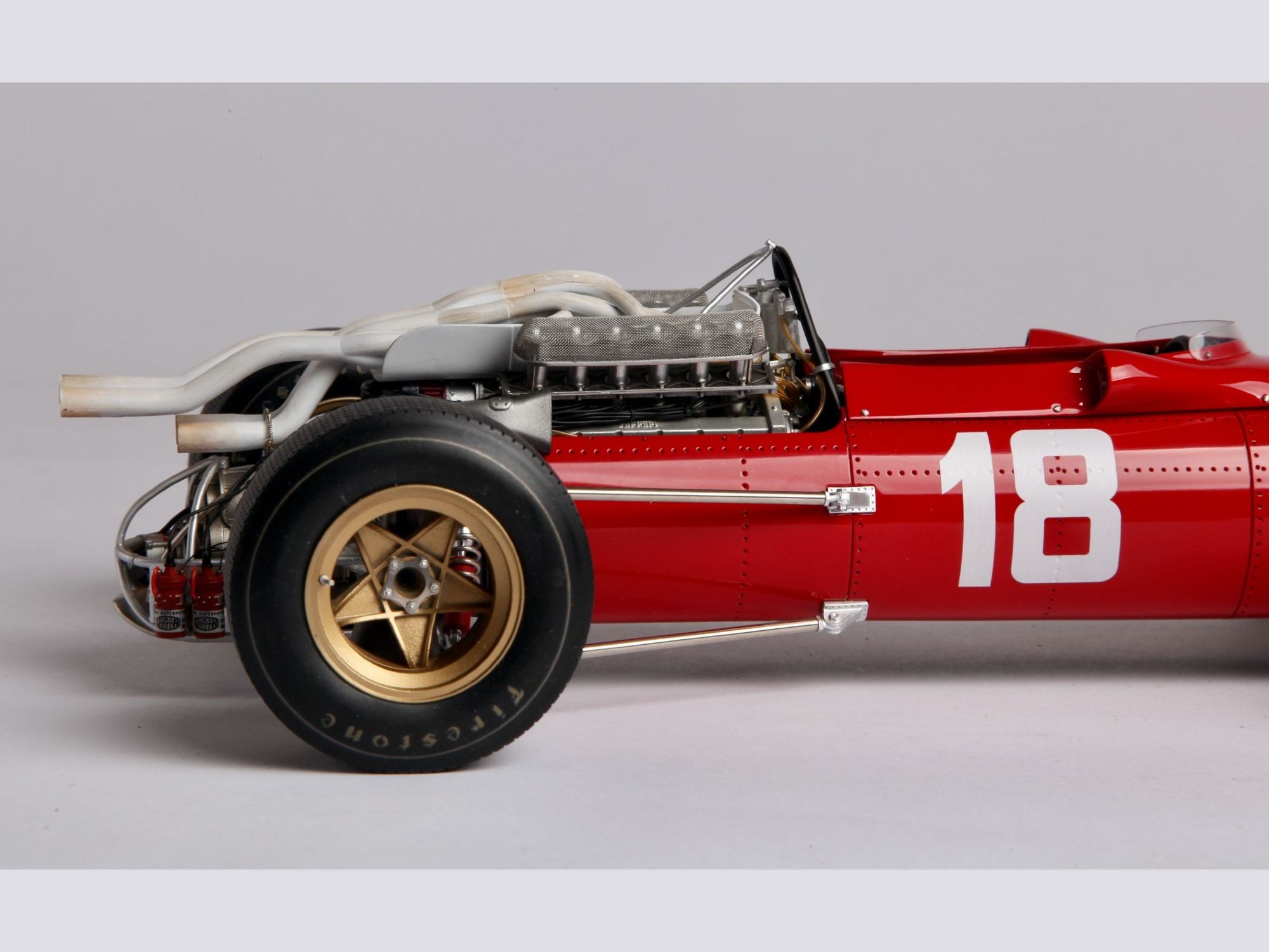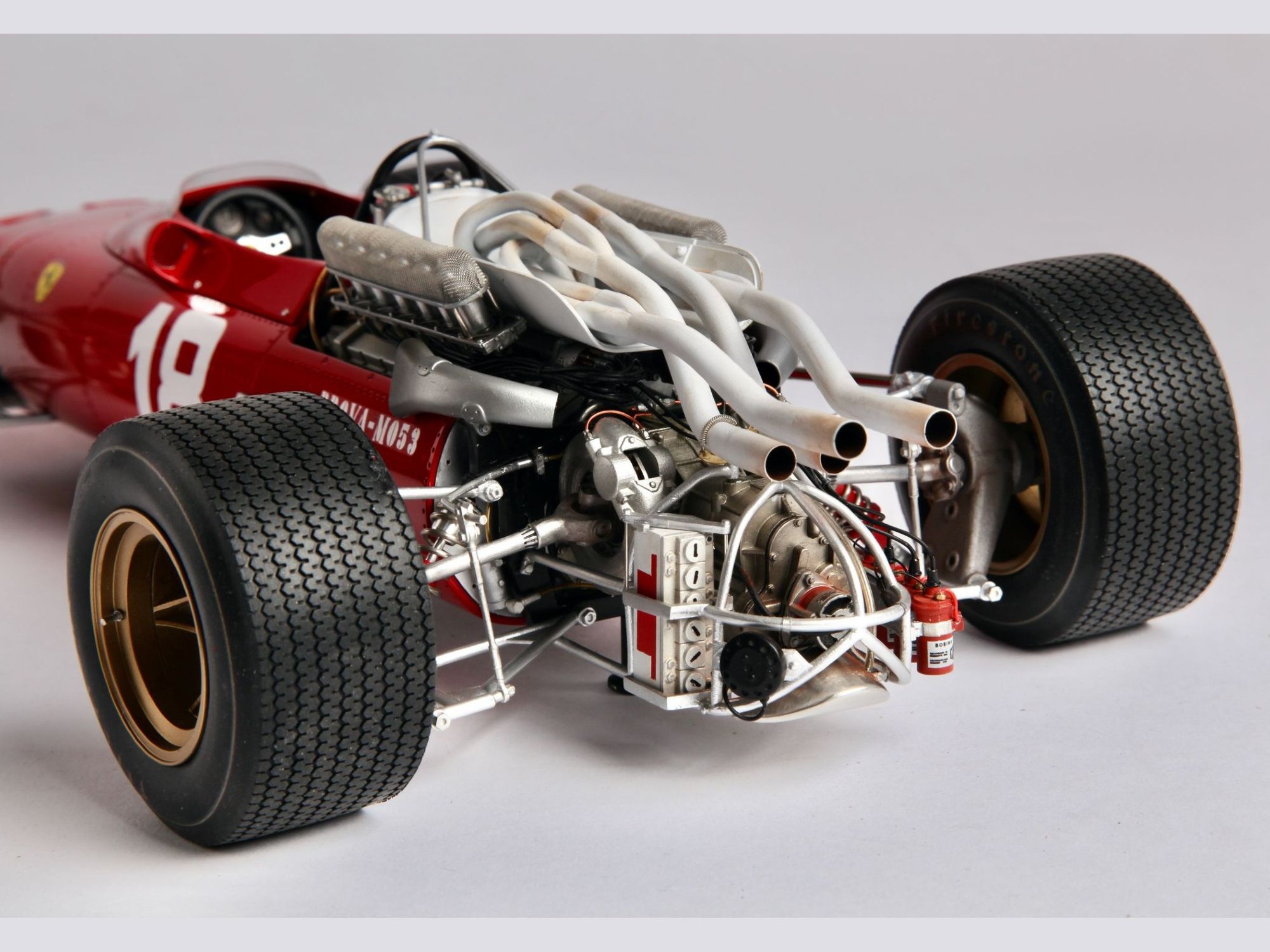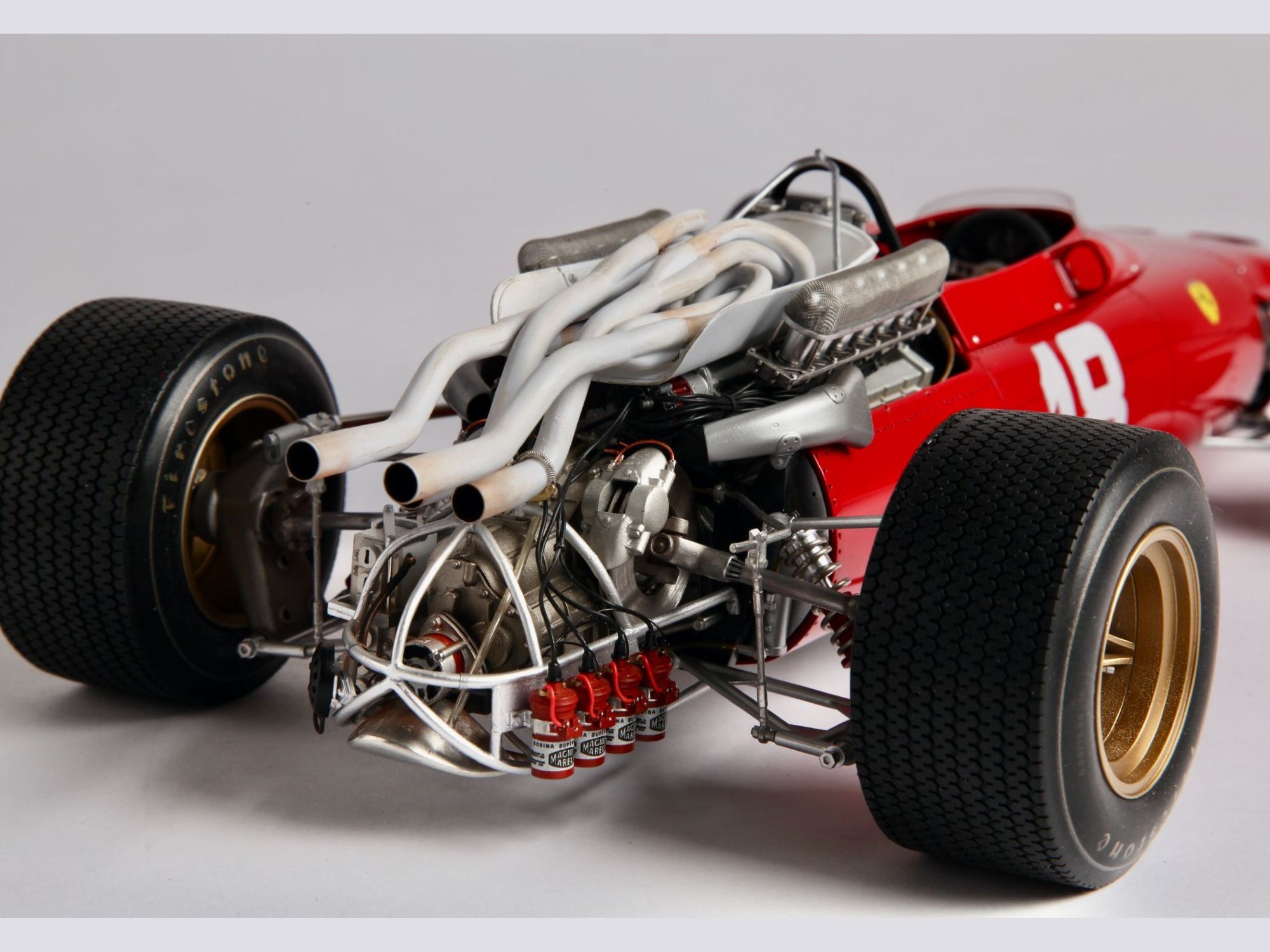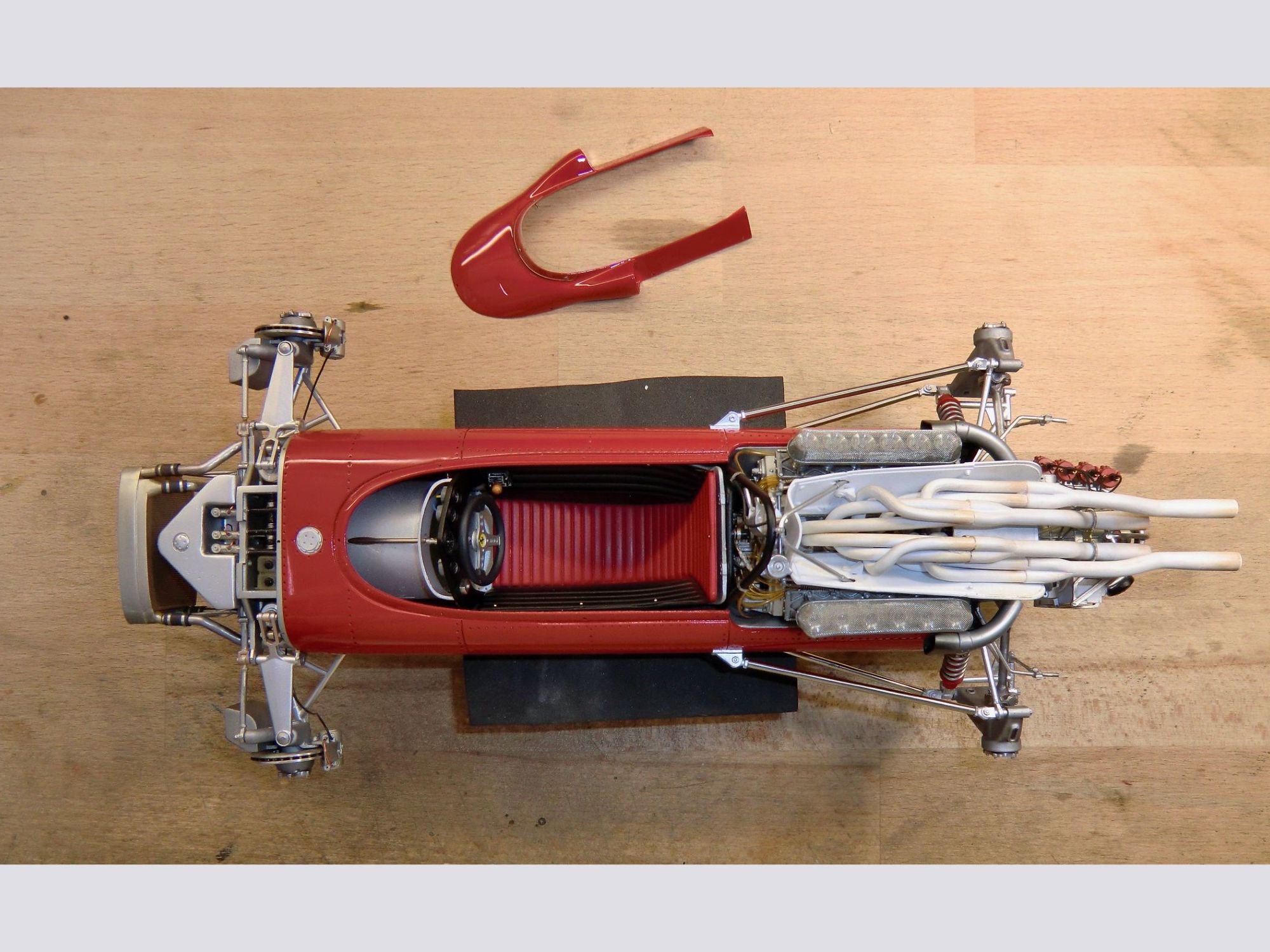 This very detailed model with a lot of accessories, all of which were cleaned or machined to fit perfectly during mounting. The different piping and ‘spaghetti” exhausts are a real challenge and need special attention to be placed with great care. The rivets alongside the engine had to be removed and placed much higher to correspond to the real racing car on that moment in 1967.