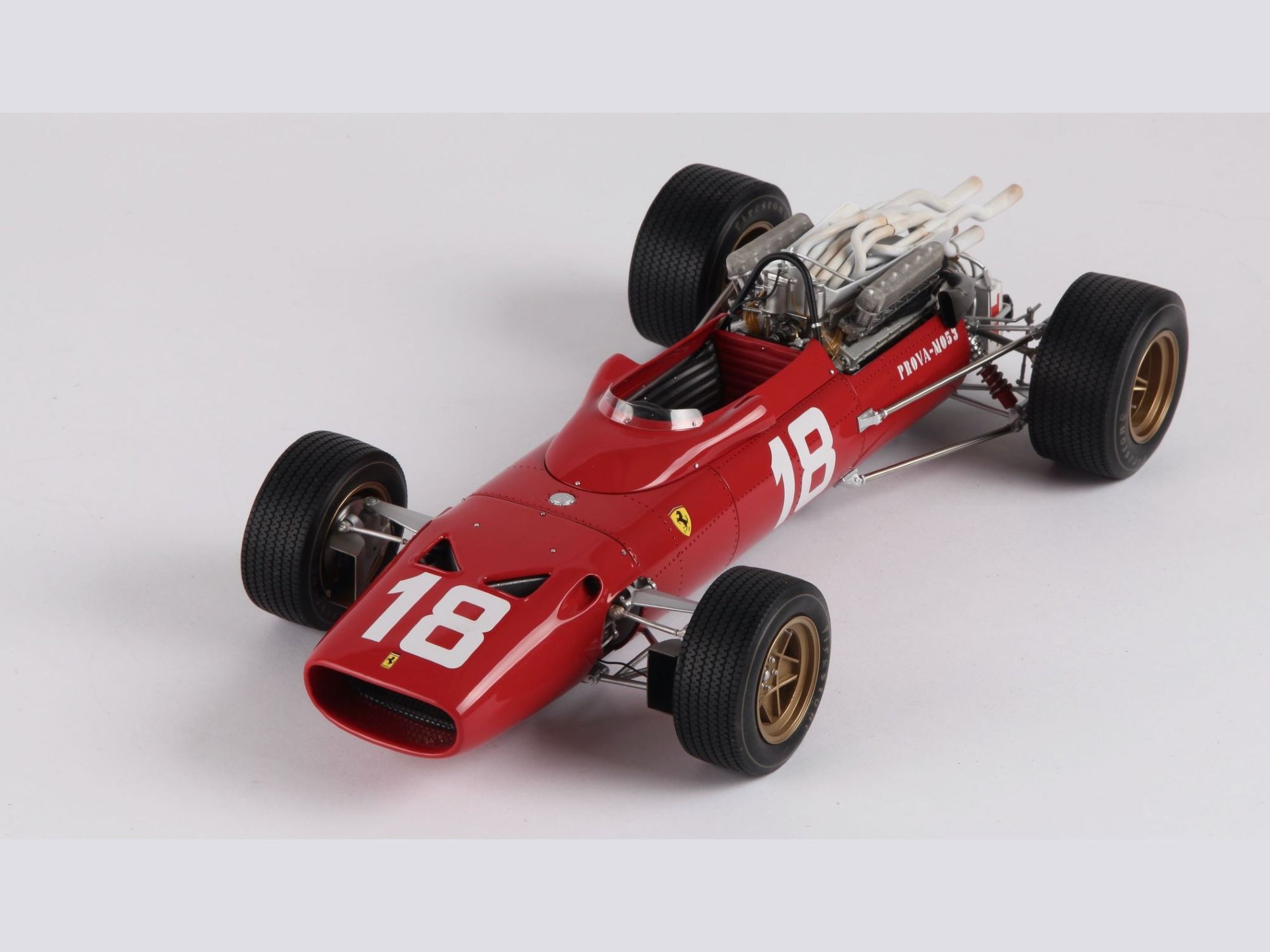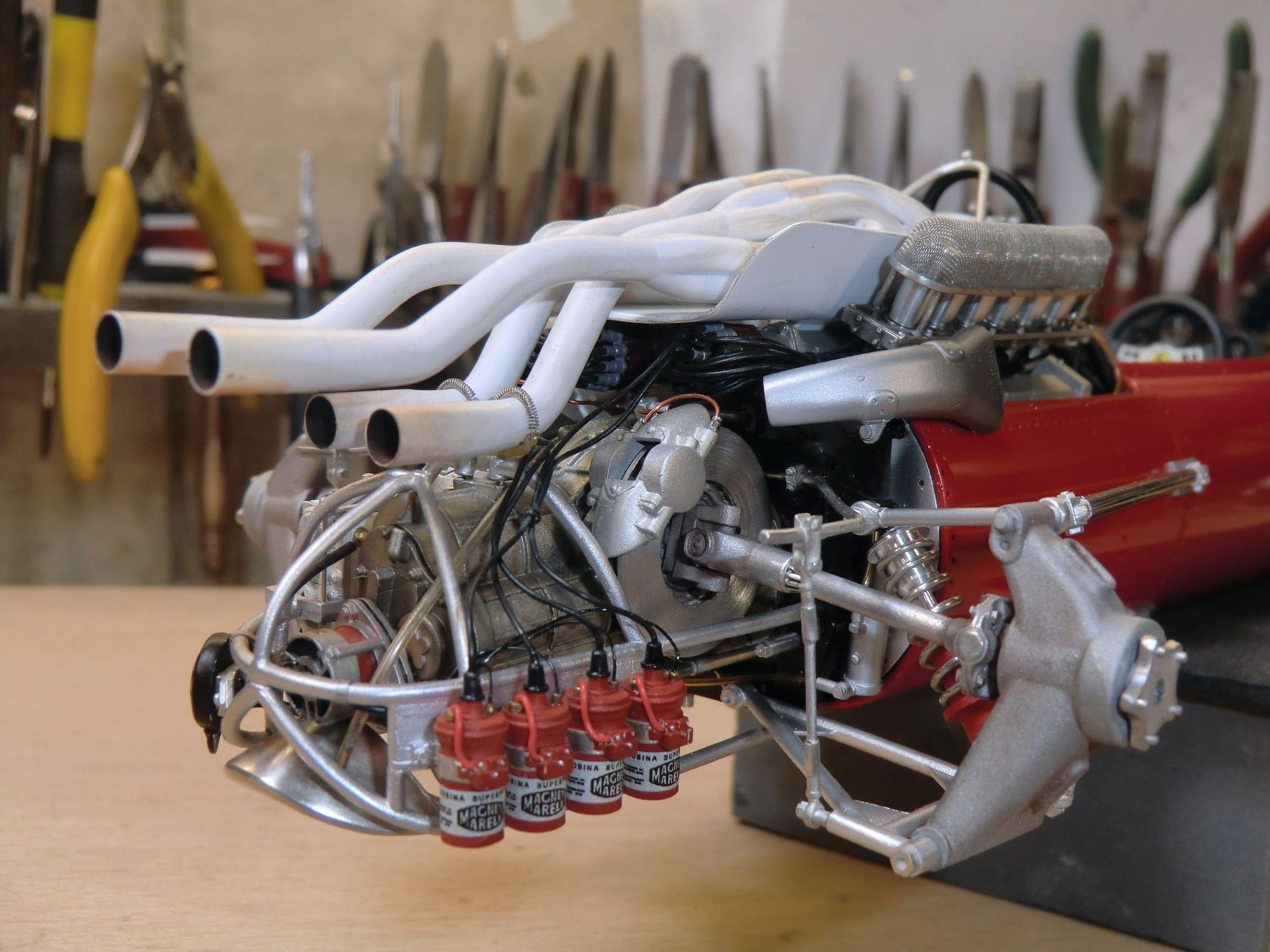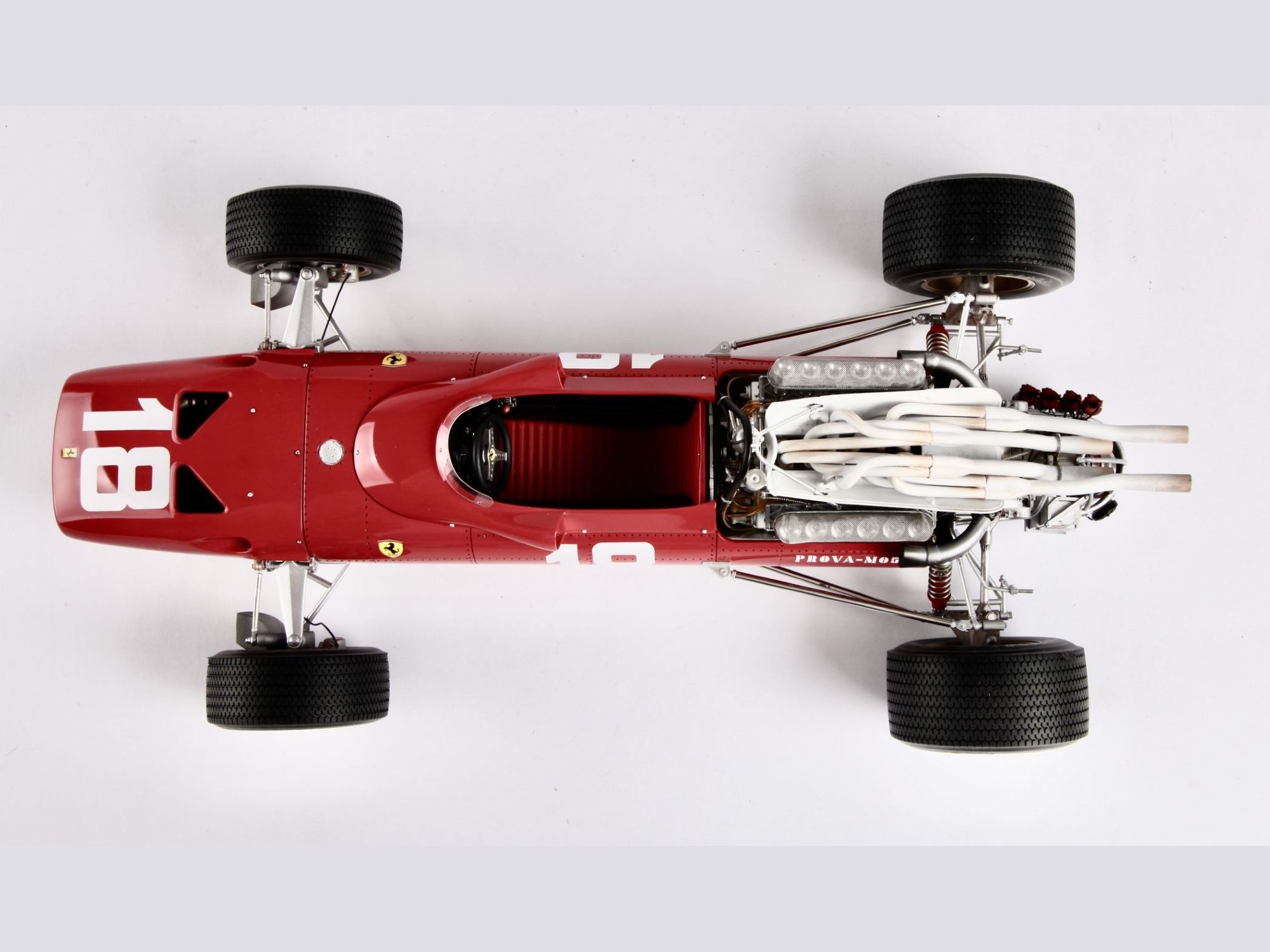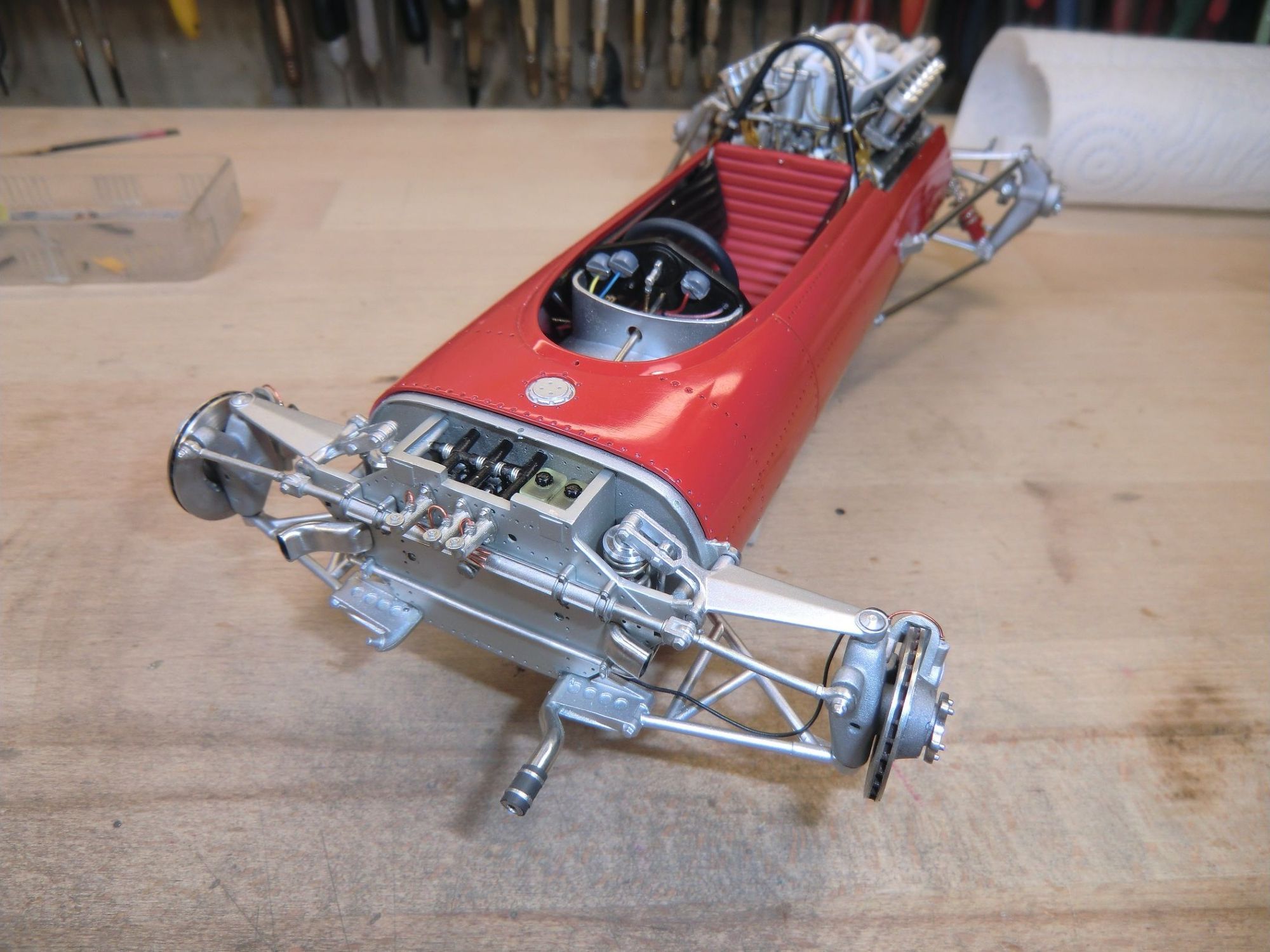 This very detailed model with a lot of accessories, all of which were cleaned or machined to fit perfectly during mounting. The different piping and ‘spaghetti” exhausts are a real challenge and need special attention to be placed with great care. The rivets alongside the engine had to be removed and placed much higher to correspond to the real racing car on that moment in 1967.