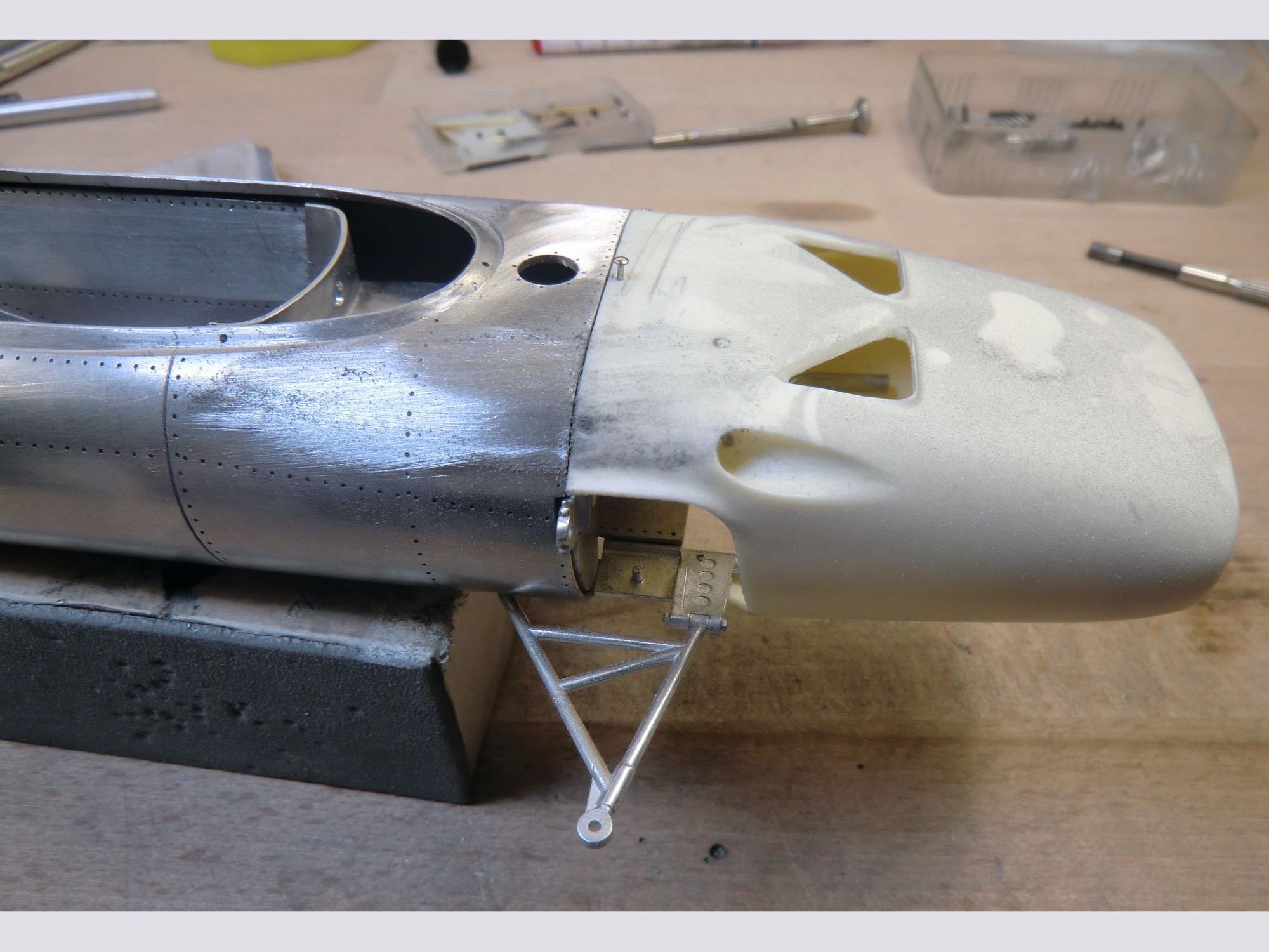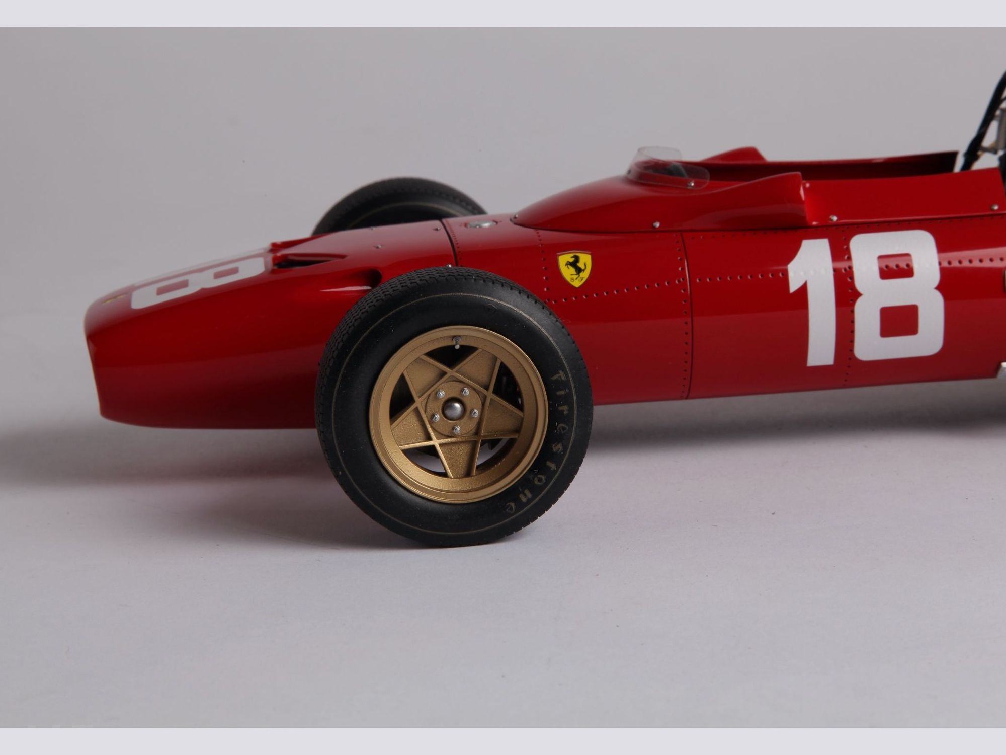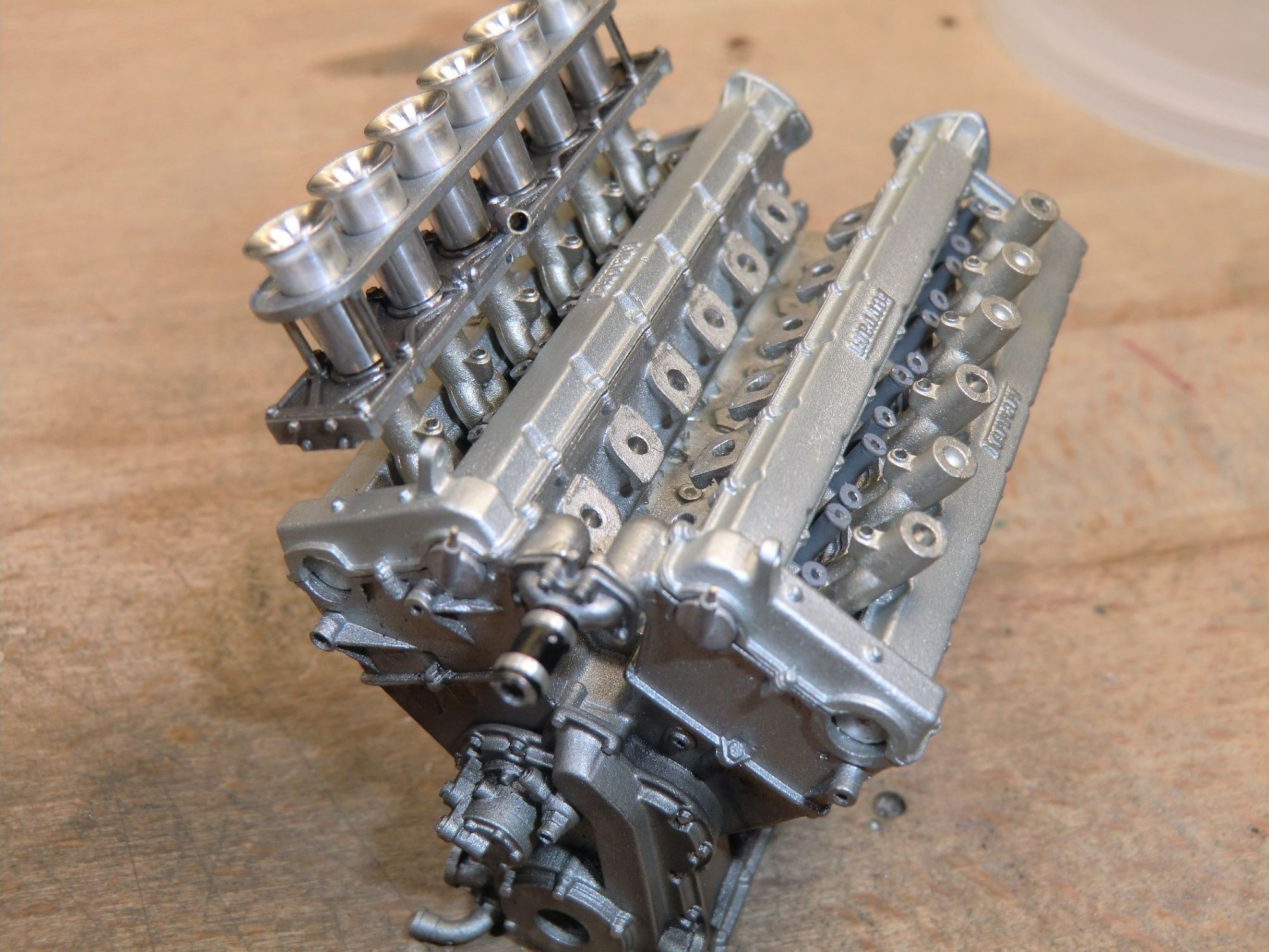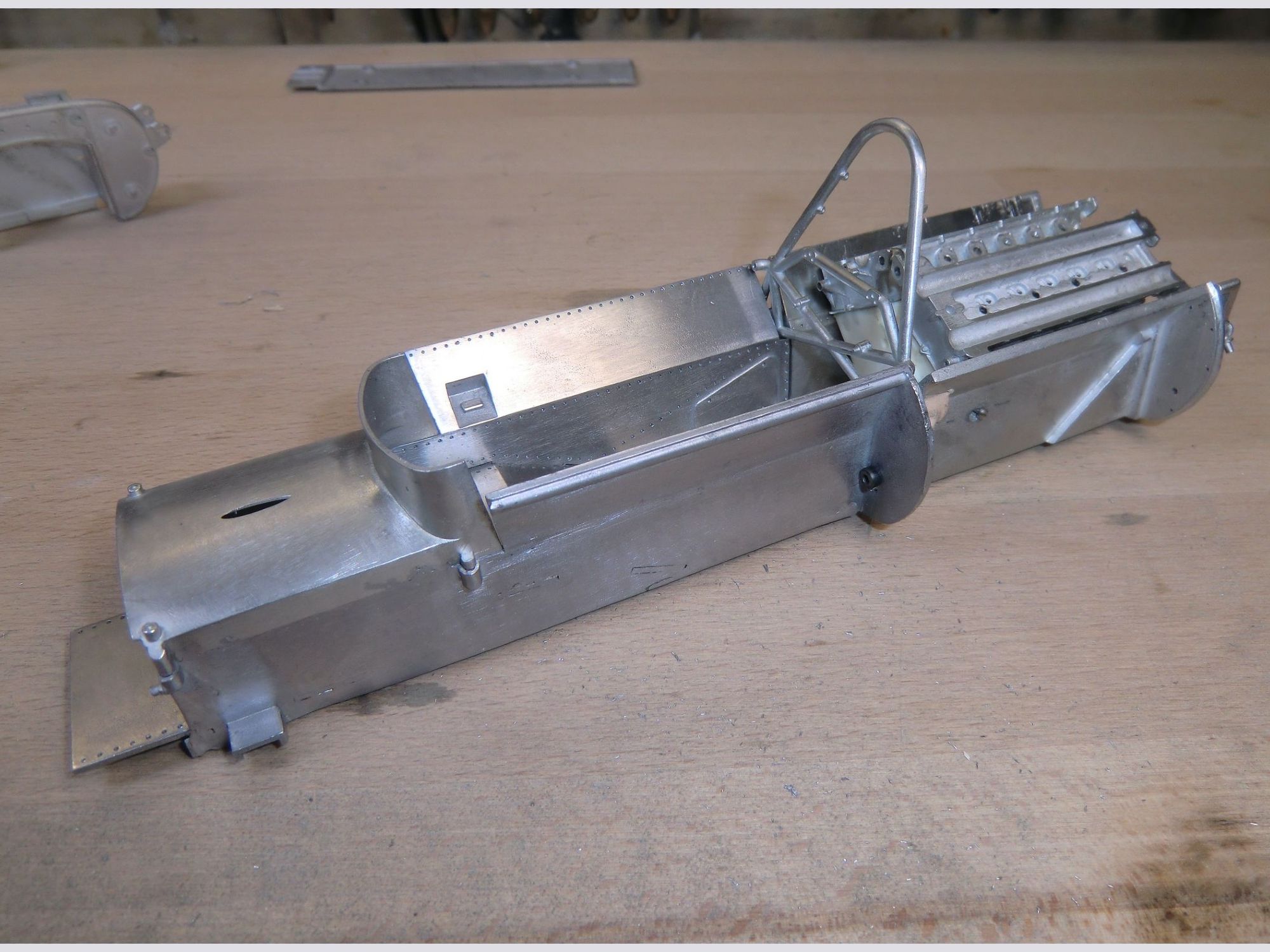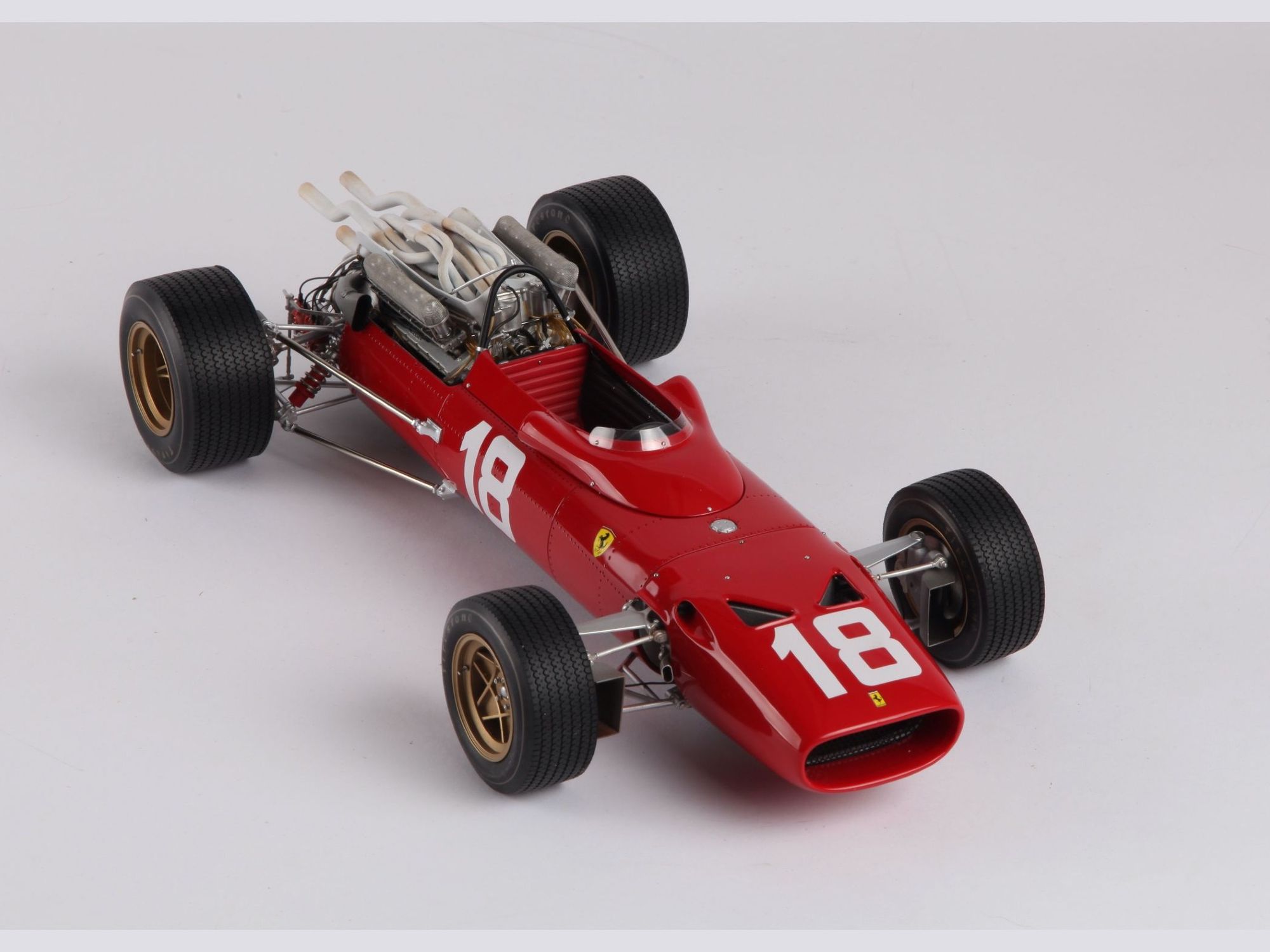 This very detailed model with a lot of accessories, all of which were cleaned or machined to fit perfectly during mounting. The different piping and ‘spaghetti” exhausts are a real challenge and need special attention to be placed with great care. The rivets alongside the engine had to be removed and placed much higher to correspond to the real racing car on that moment in 1967.