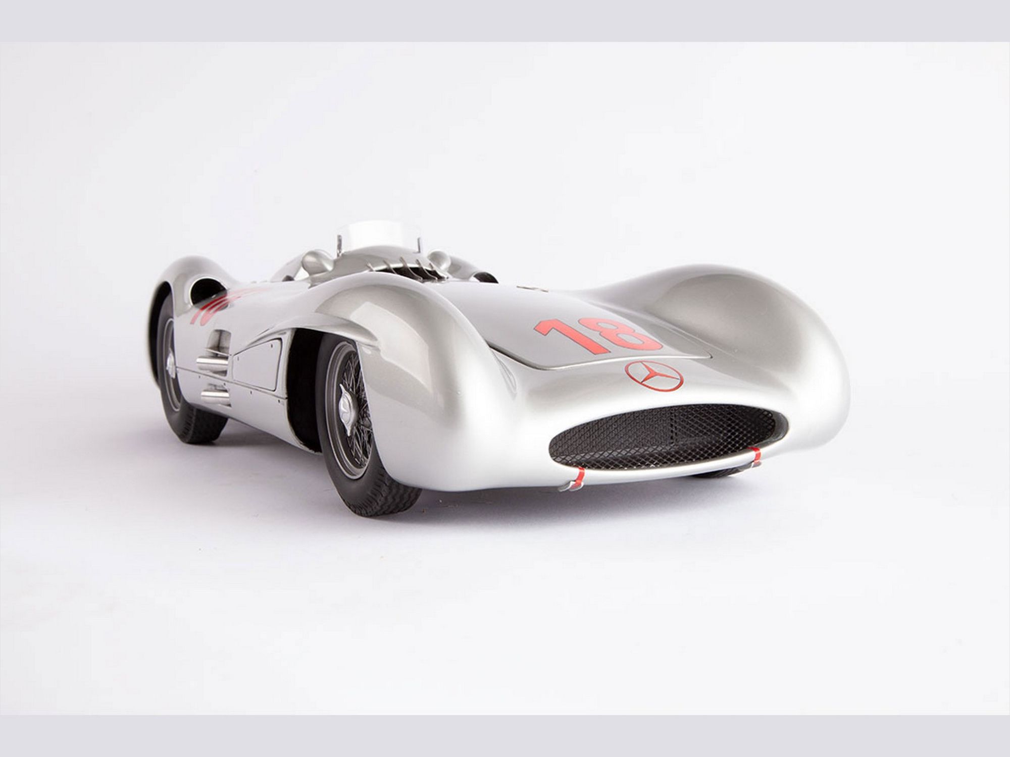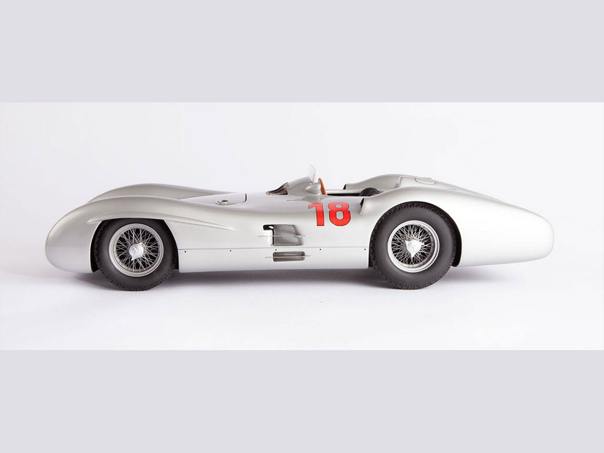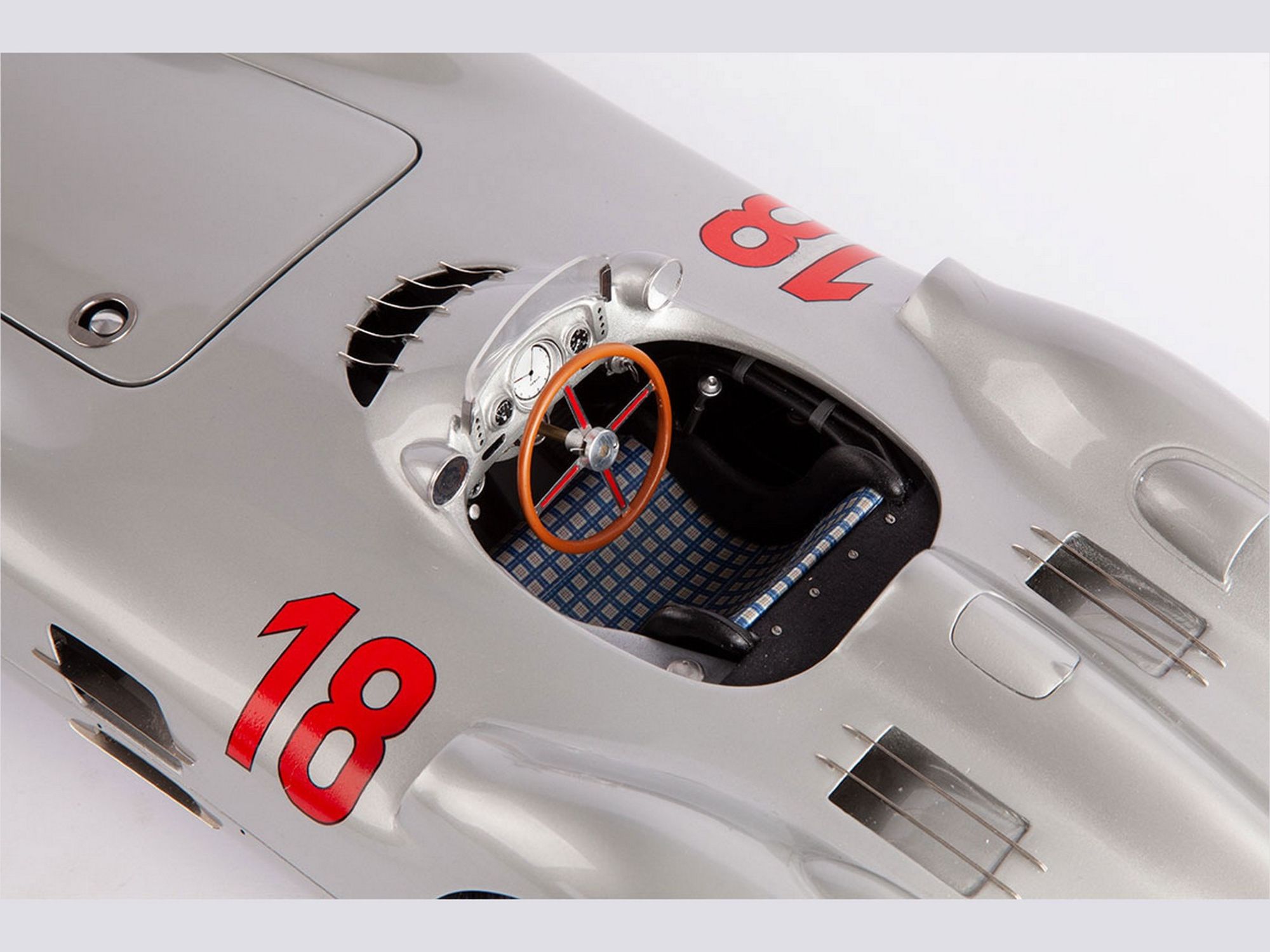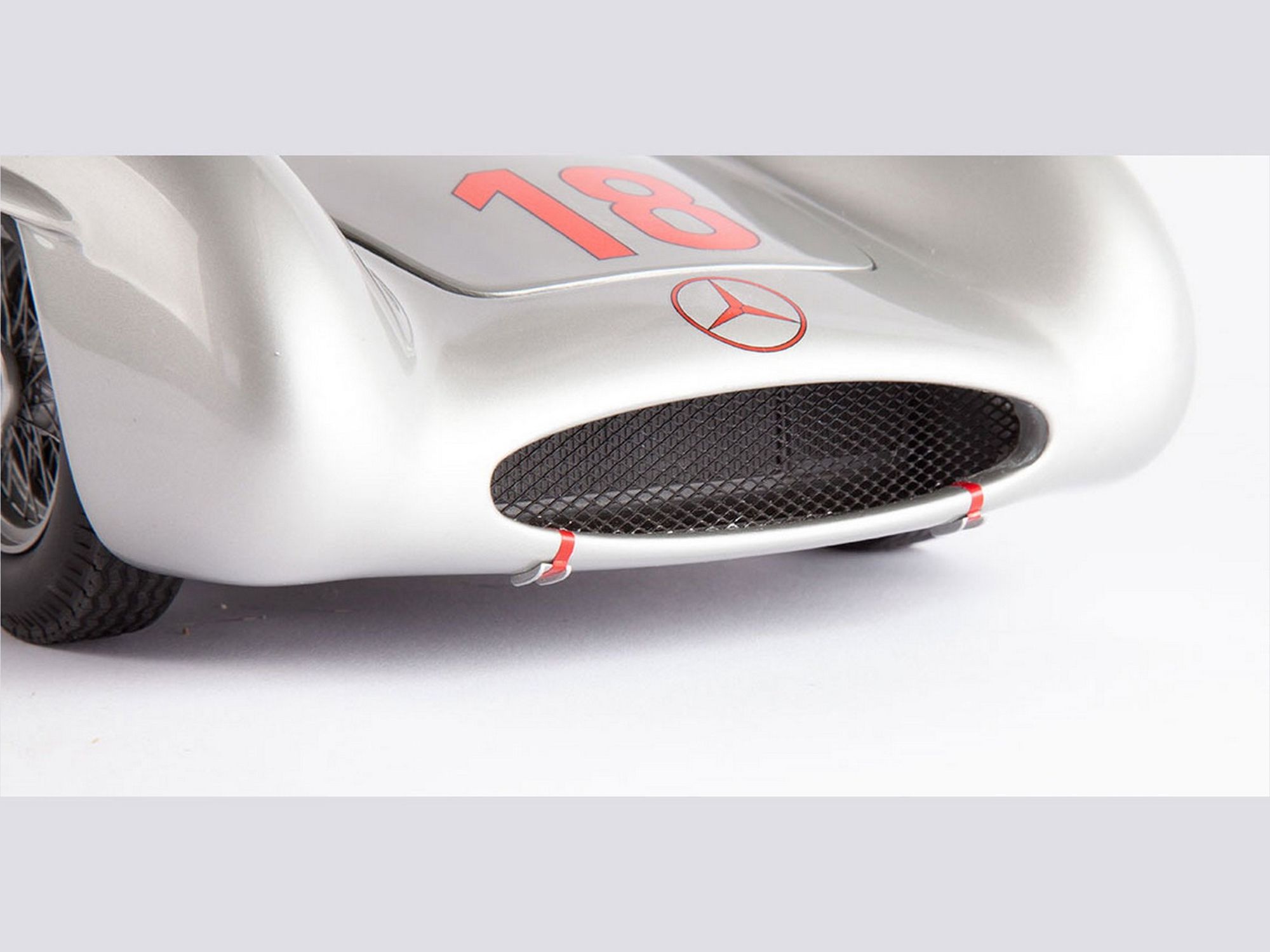 It is an old and rare kit of the Mercedes-Benz W196R that won the French Grand Prix at Reims in 1954 driven by Juan Manuel Fangio. Some corrections were needed on the fences and a number of details had to be machined to fit the model with the desired precision to render the real atmosphere.