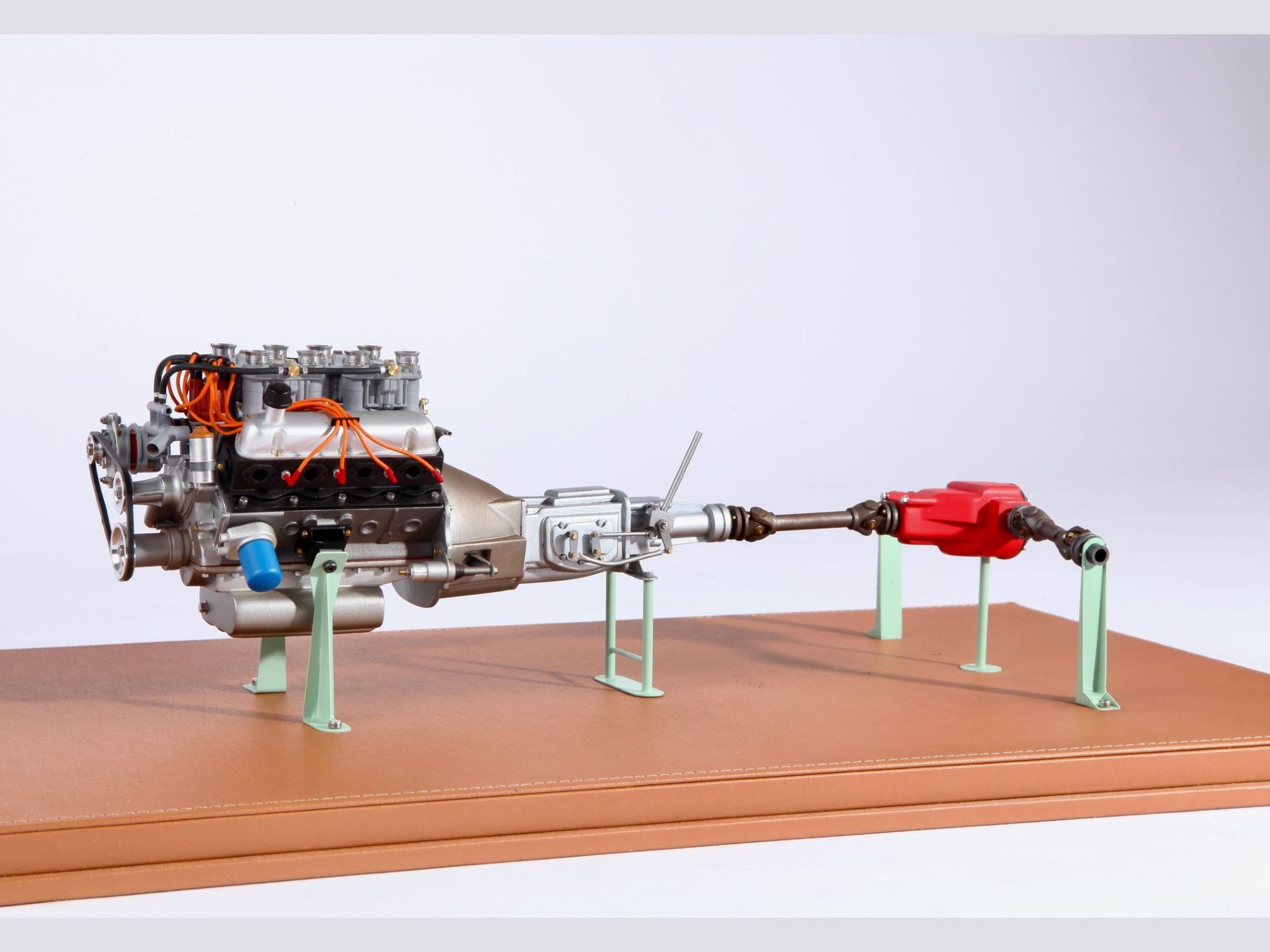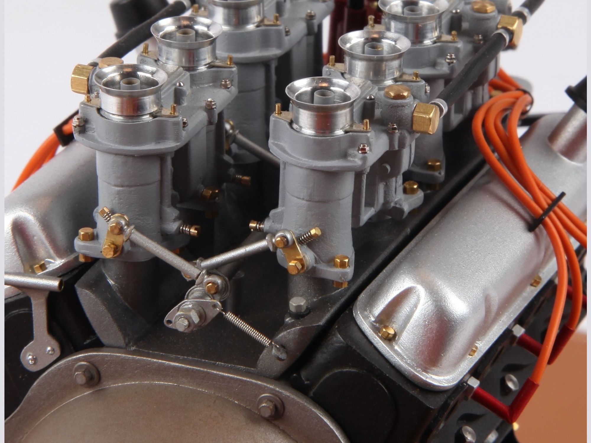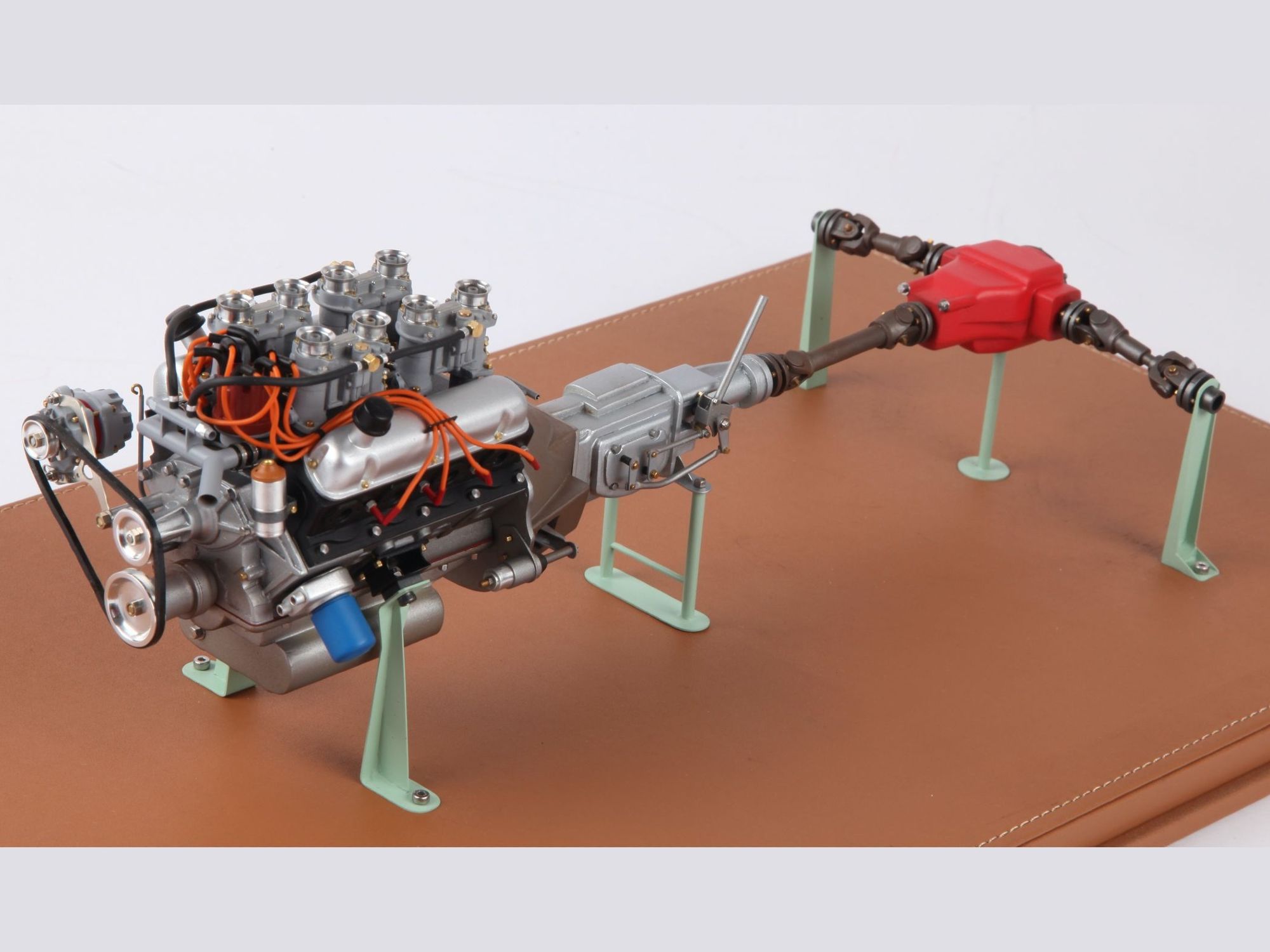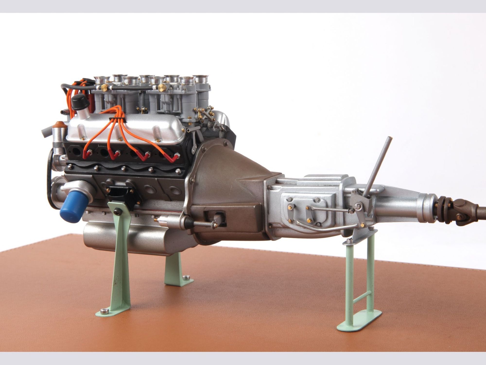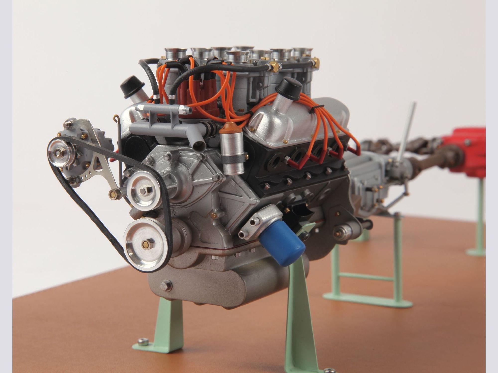 The engine can be seen on the finished model when the hood is opened, but presented as it is now, the intrinsic details can more easily be scrutinized and admired. To give an idea of the care put into such model; one double carburetor contains 42 different pieces and there are four of them, one transmission shaft has no less than 33 single pieces, here there are three of them.