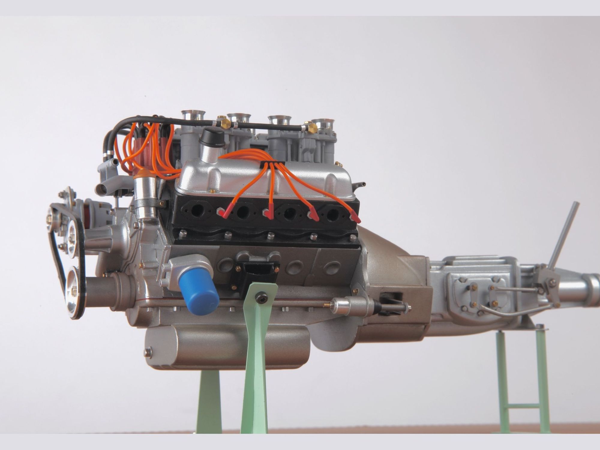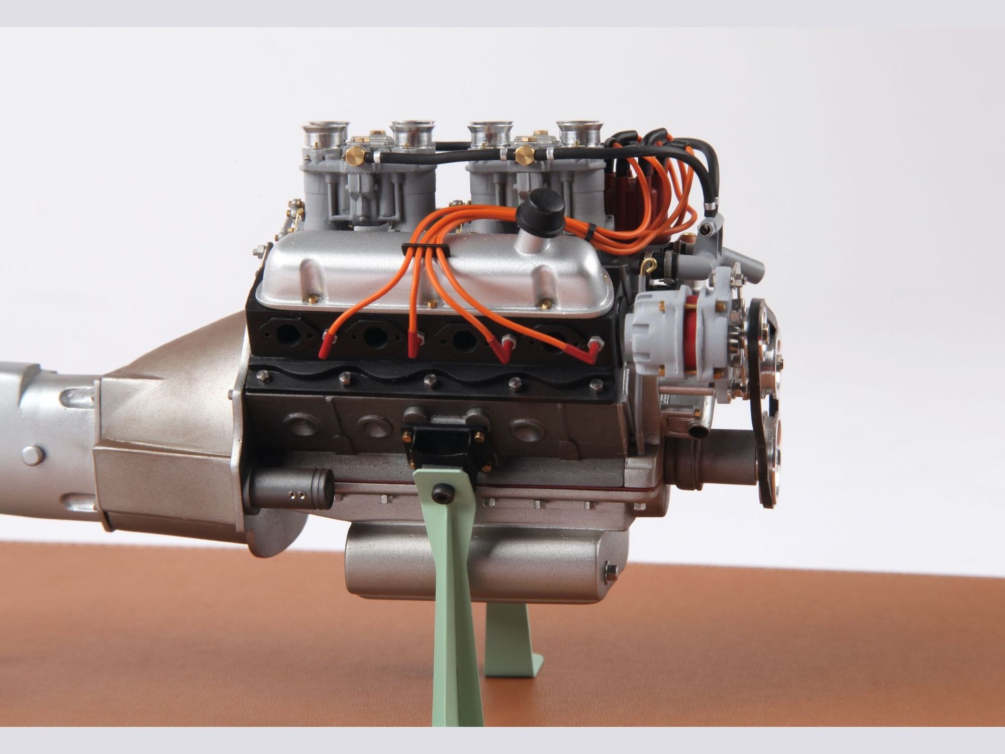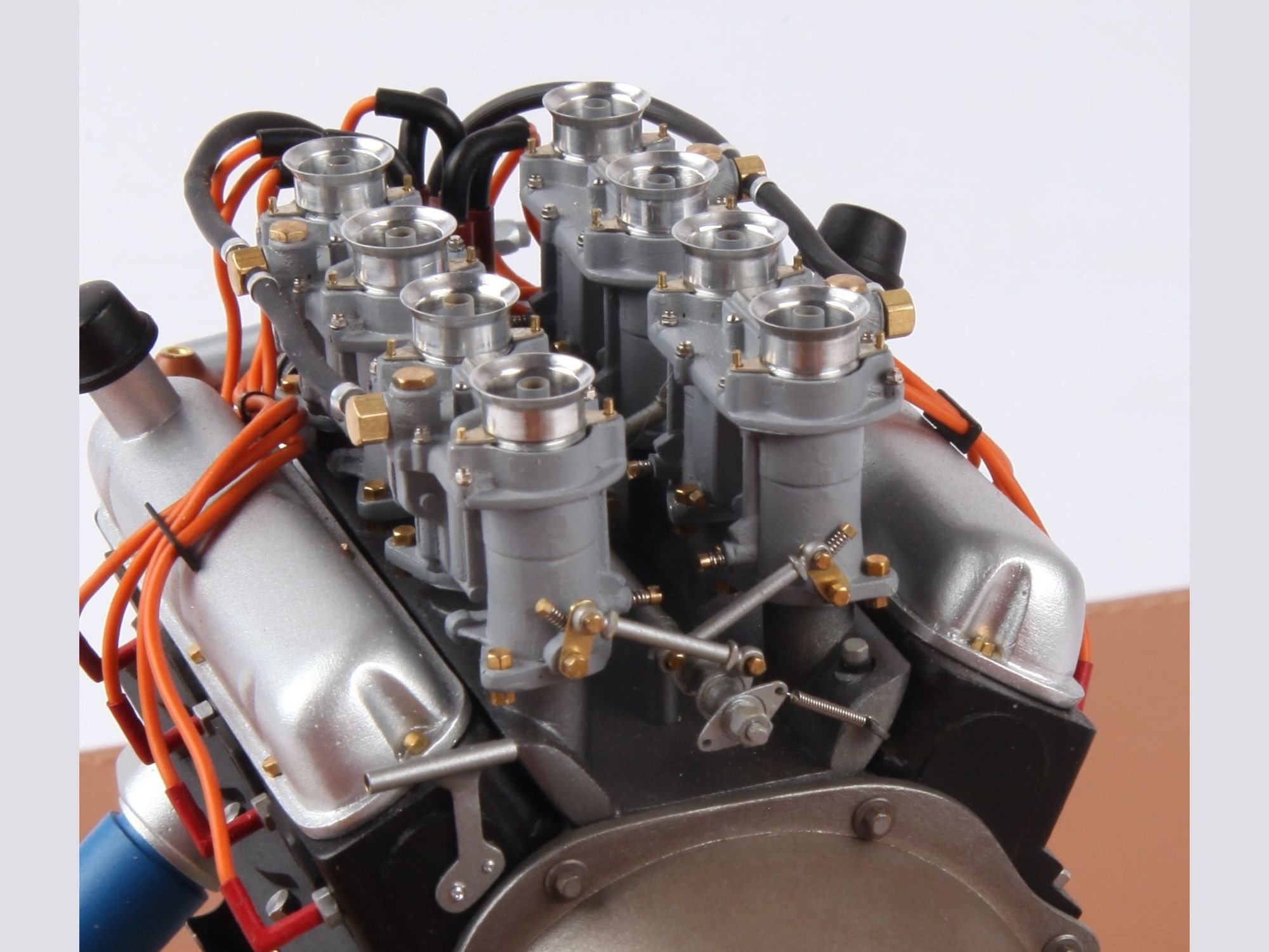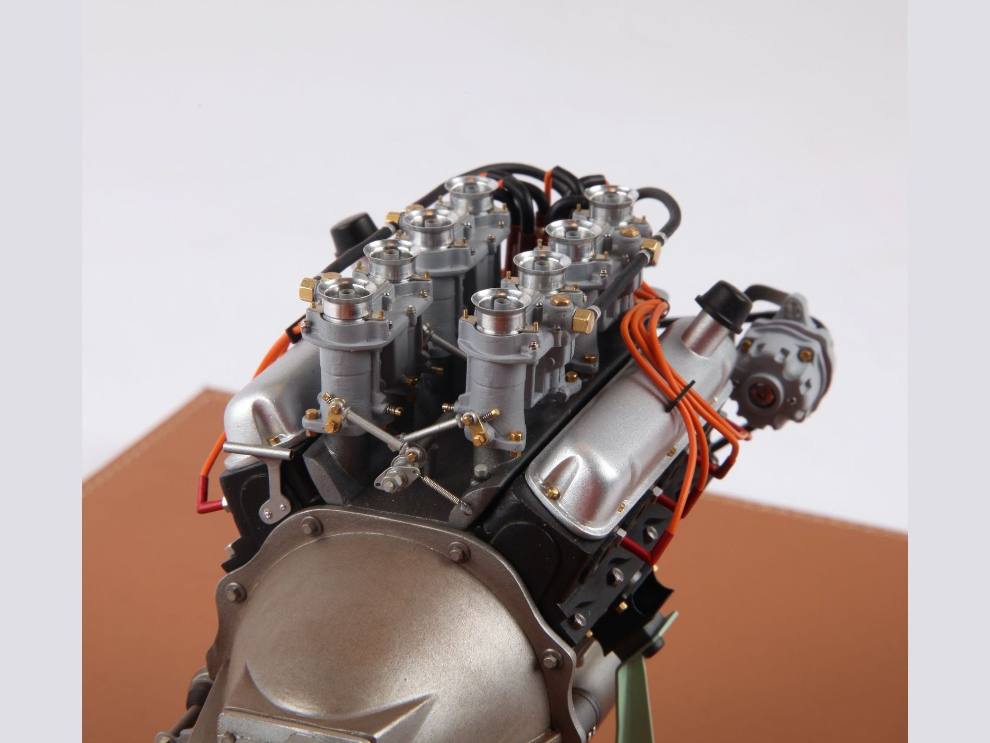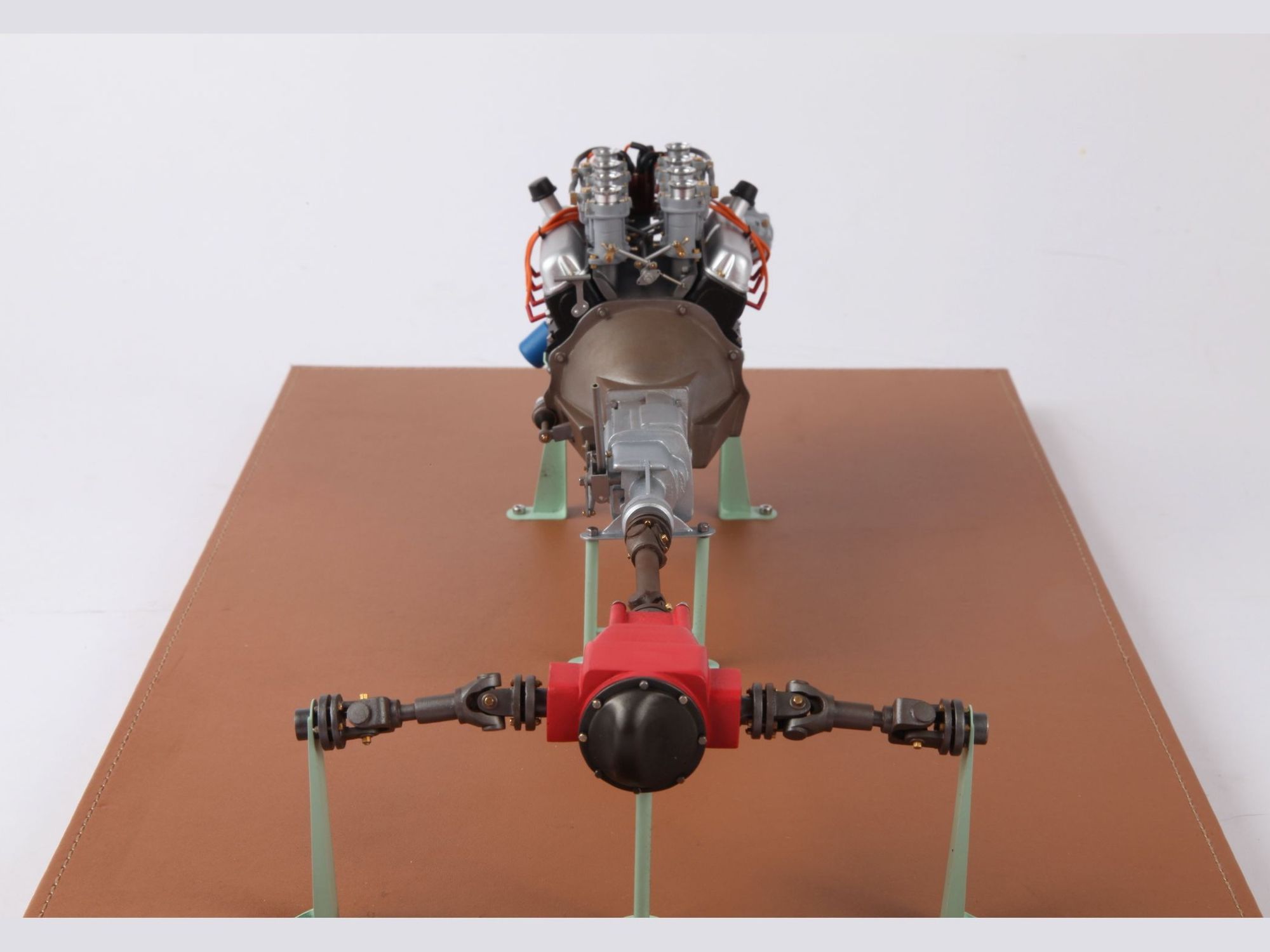 The engine can be seen on the finished model when the hood is opened, but presented as it is now, the intrinsic details can more easily be scrutinized and admired. To give an idea of the care put into such model; one double carburetor contains 42 different pieces and there are four of them, one transmission shaft has no less than 33 single pieces, here there are three of them.