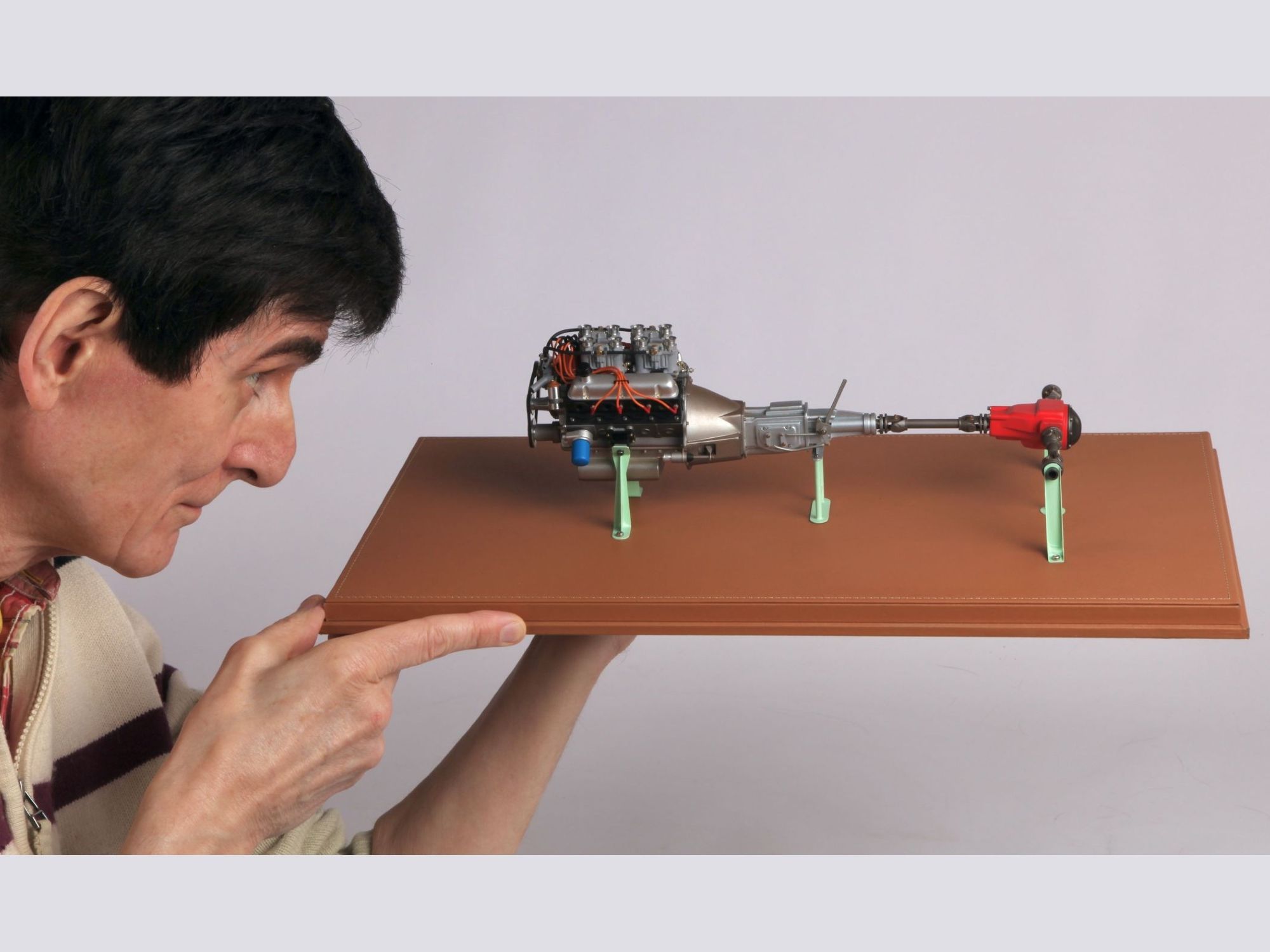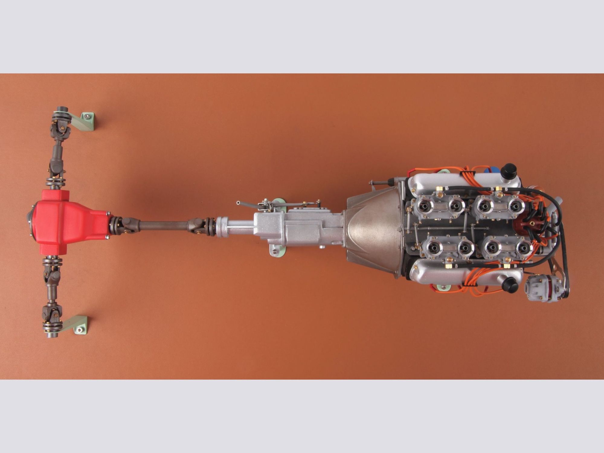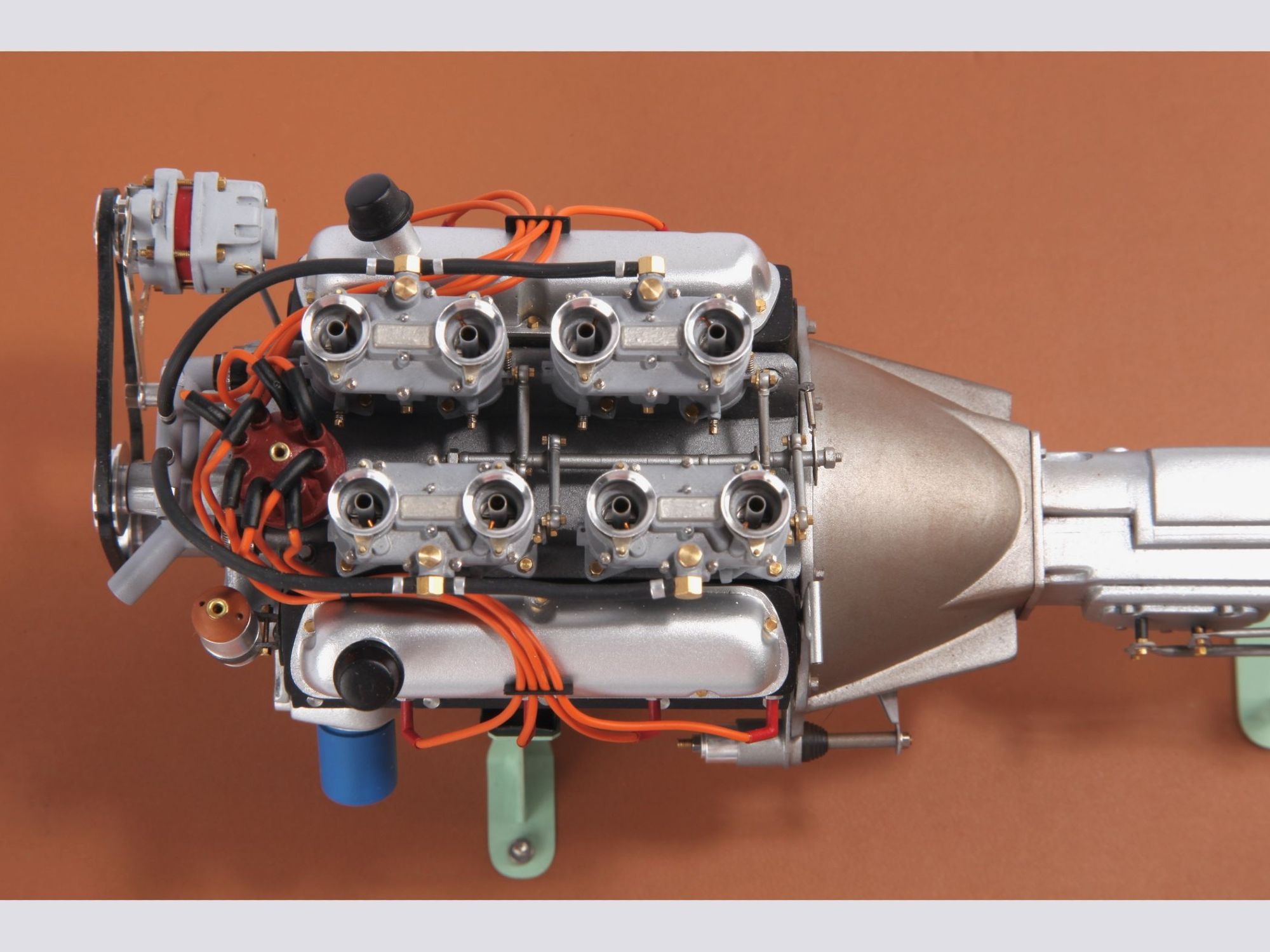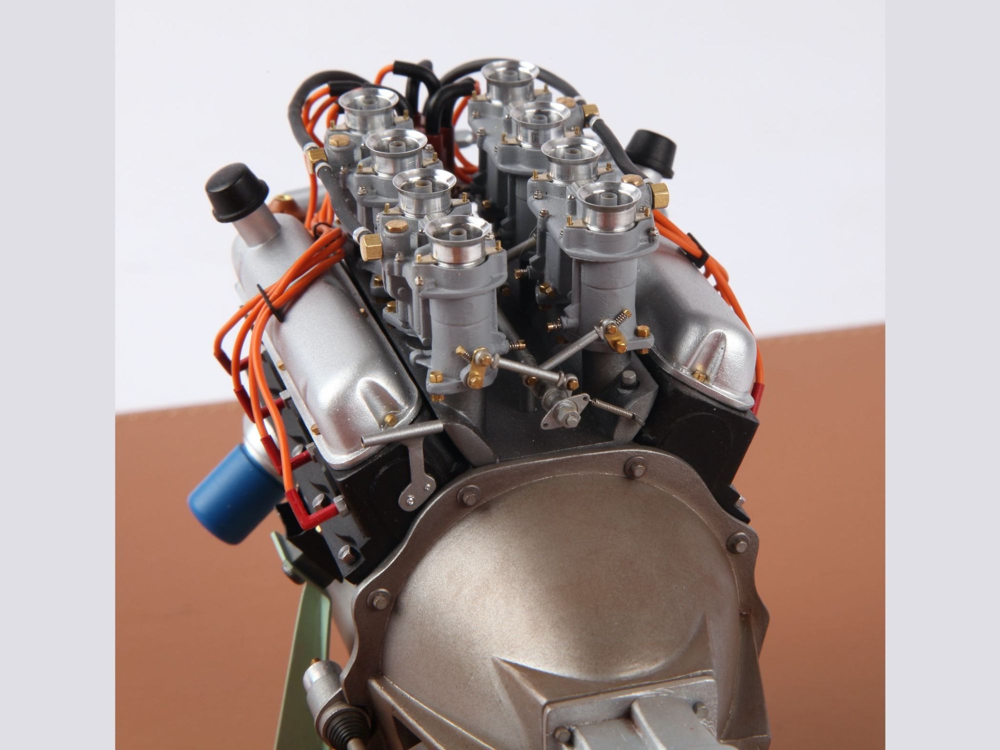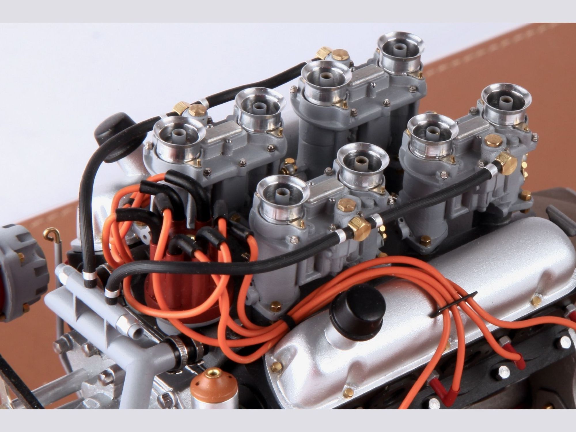 The engine can be seen on the finished model when the hood is opened, but presented as it is now, the intrinsic details can more easily be scrutinized and admired. To give an idea of the care put into such model; one double carburetor contains 42 different pieces and there are four of them, one transmission shaft has no less than 33 single pieces, here there are three of them.
