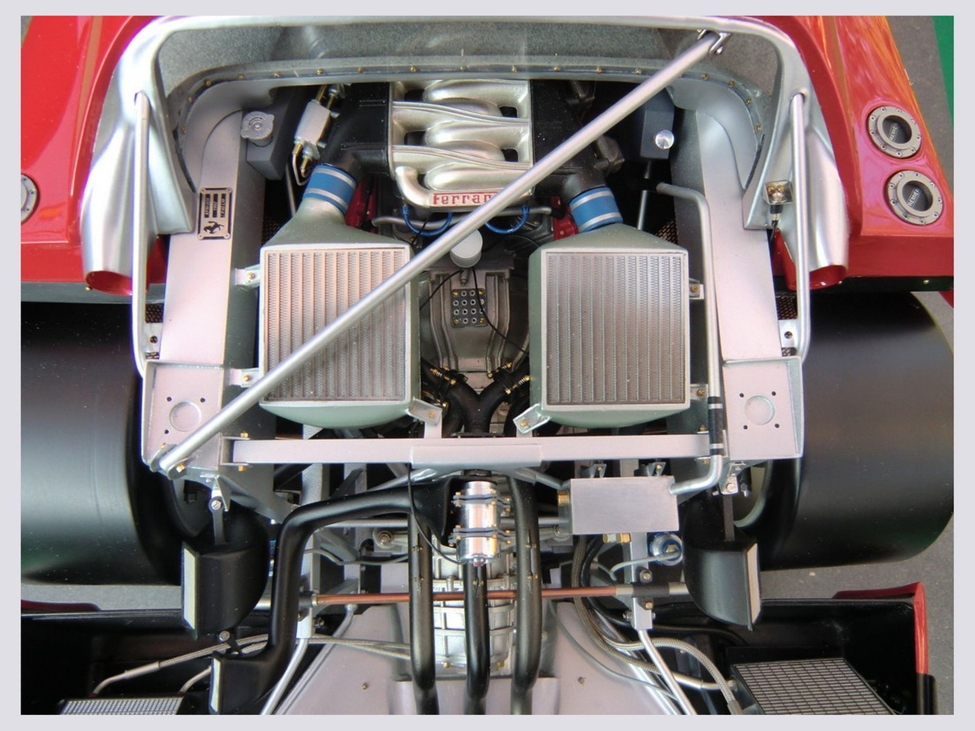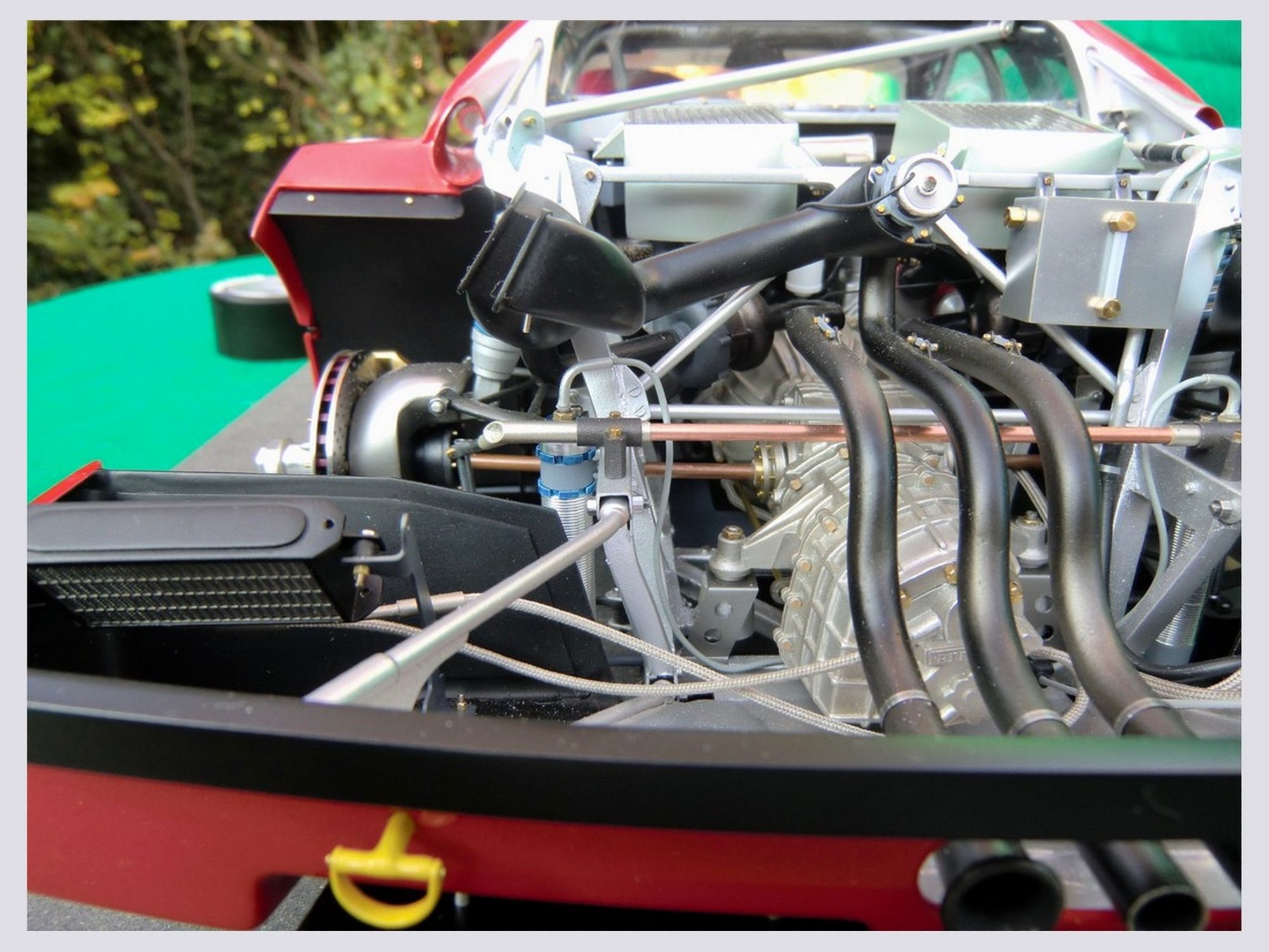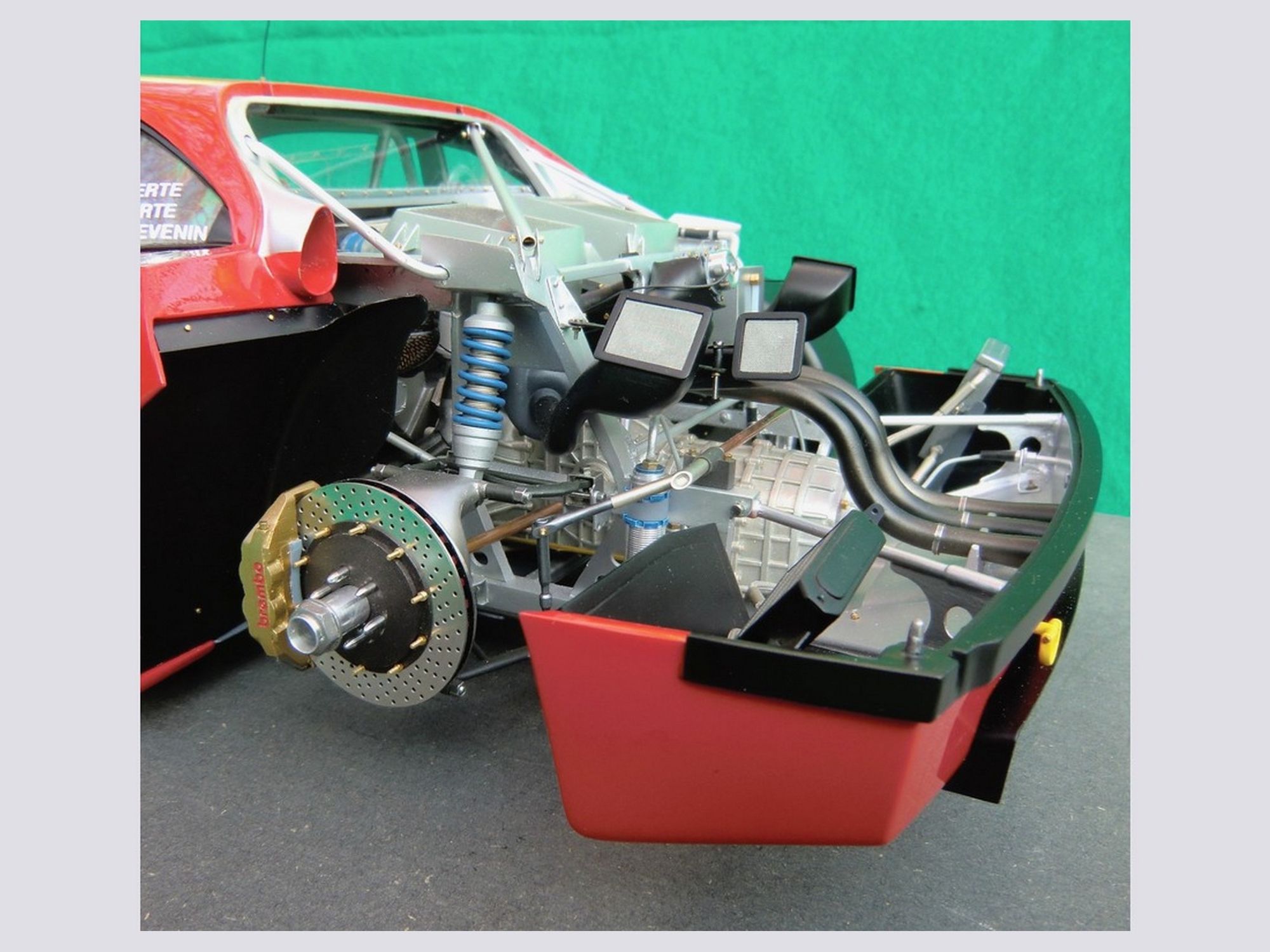The 1/8 scale model car of the F40 LM is based on the Pocher model car kit, where most of frame was reinforced in brass or rebuild completely. The front of the model was reinforced with solid aluminum plates. Most of the body parts were reshaped to become full LM specifications. All of this was scratch build with no transkit ever used.