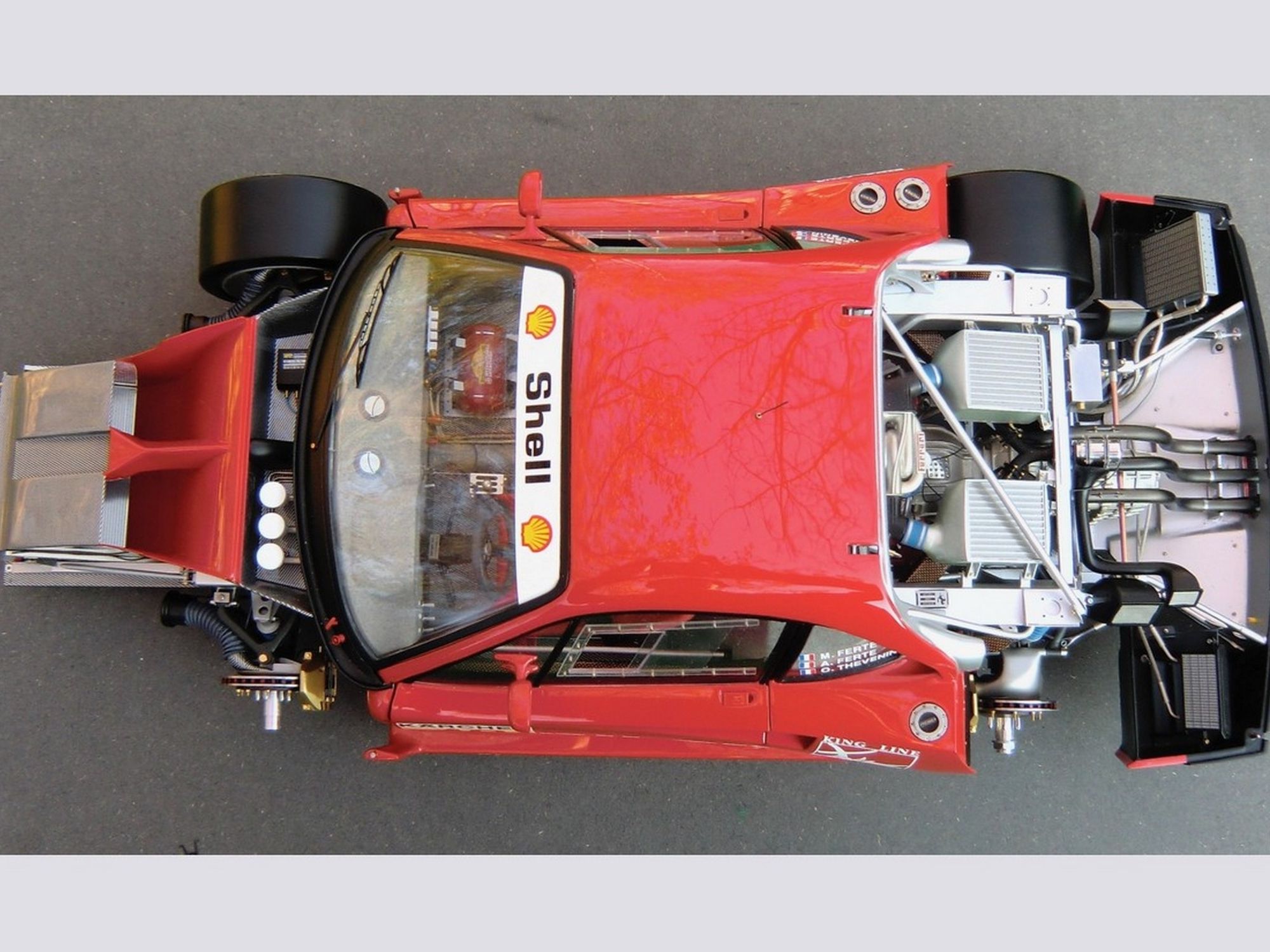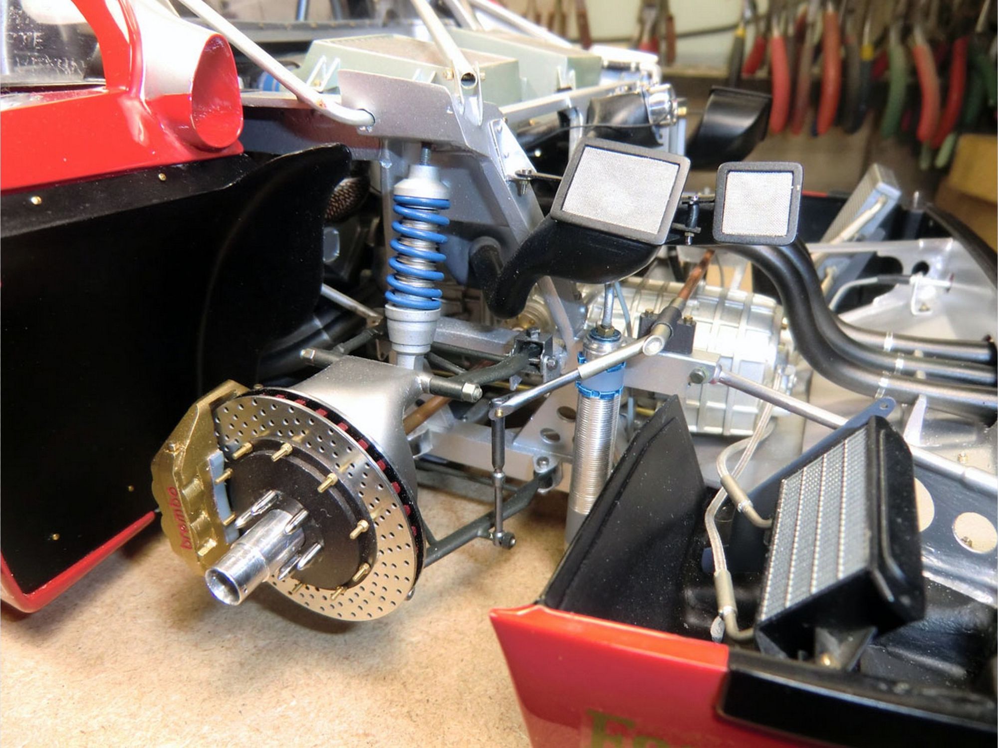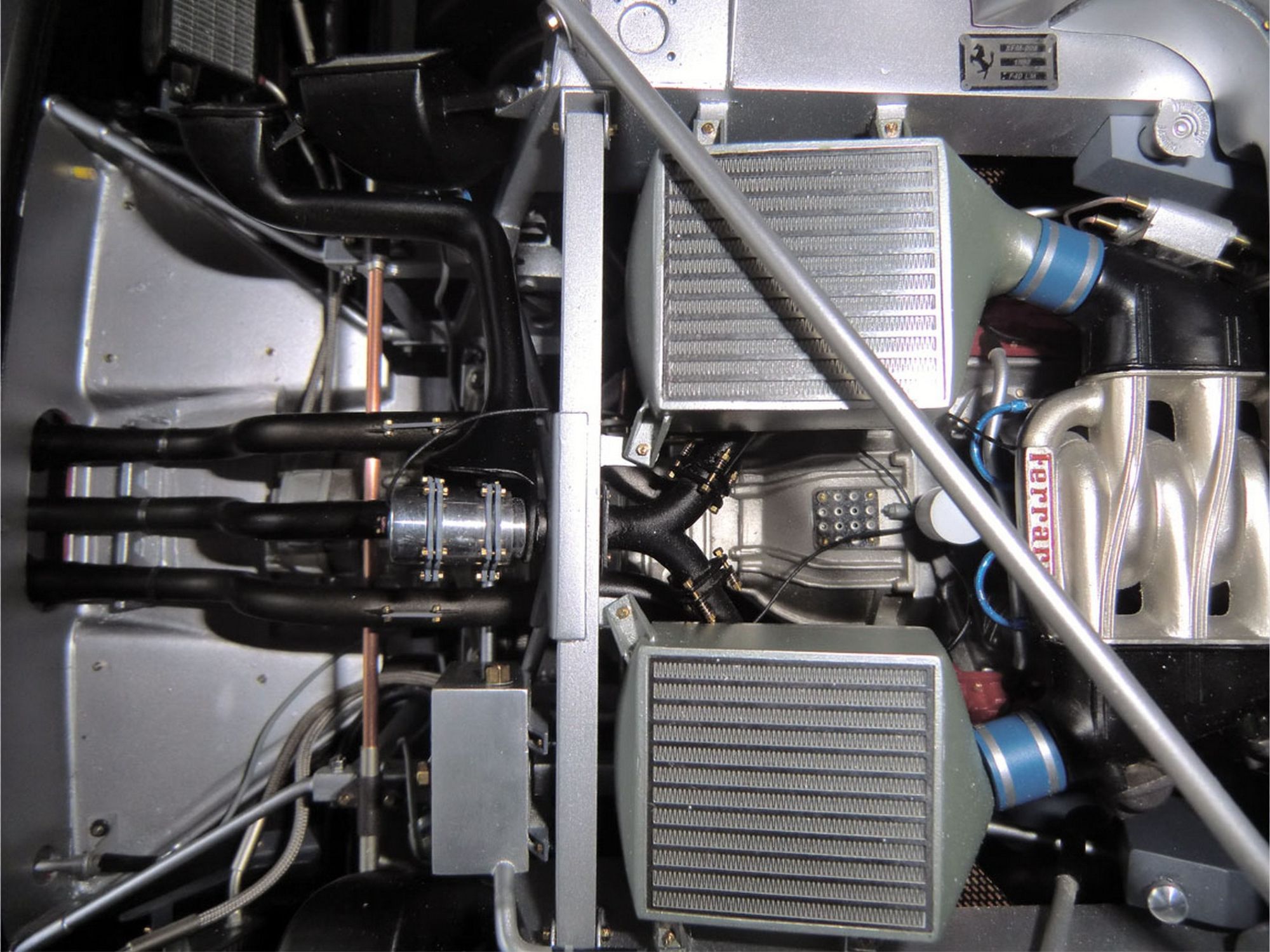 The 1/8 scale model car of the F40 LM is based on the Pocher model car kit, where most of frame was reinforced in brass or rebuild completely. The front of the model was reinforced with solid aluminum plates. Most of the body parts were reshaped to become full LM specifications. All of this was scratch build with no transkit ever used.